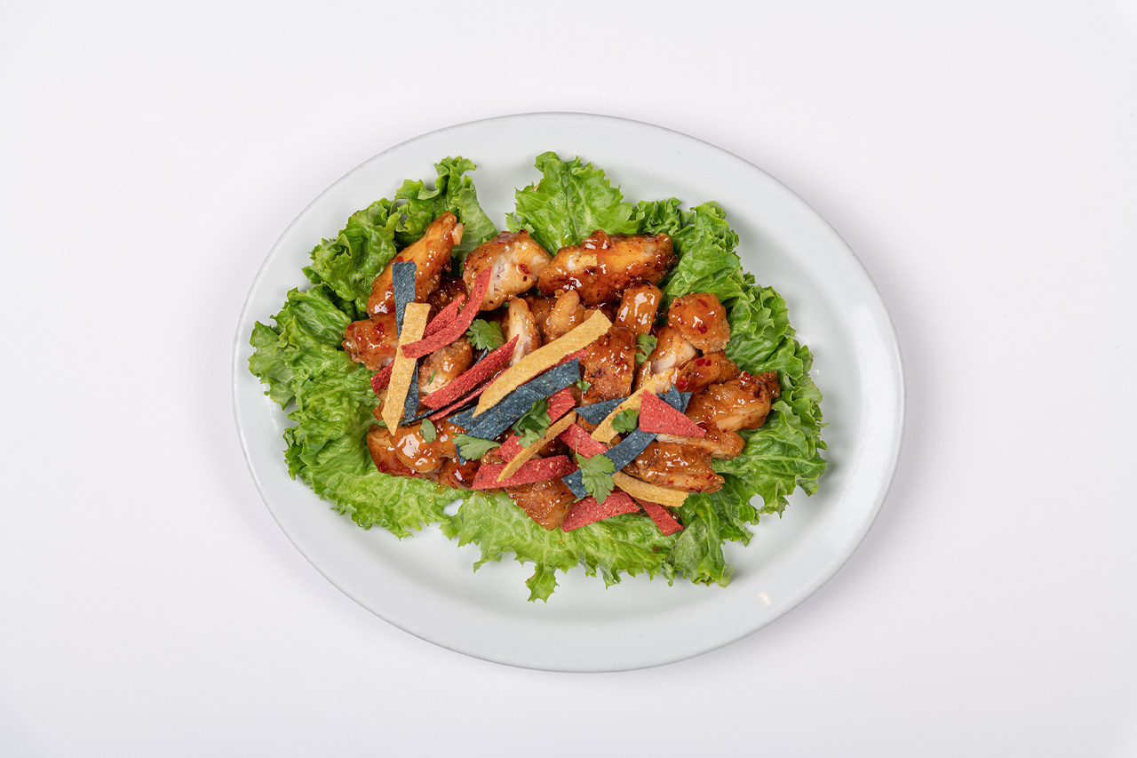 Poulet pané agrémenté d’une sauce chili à la thaï sucrée. Le tout est recouvert de lanières de tortilla croustillantes. |