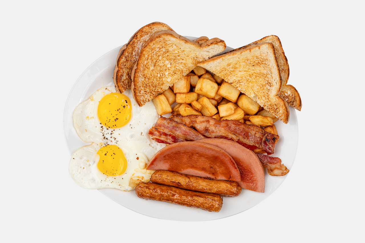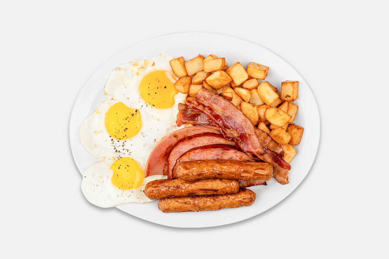 Trois œufs à votre goût, du bacon, des saucisses, du jambon et de la mortadelle frite. Servis avec des pommes de terre rissolées et du pain grillé. | ![]()