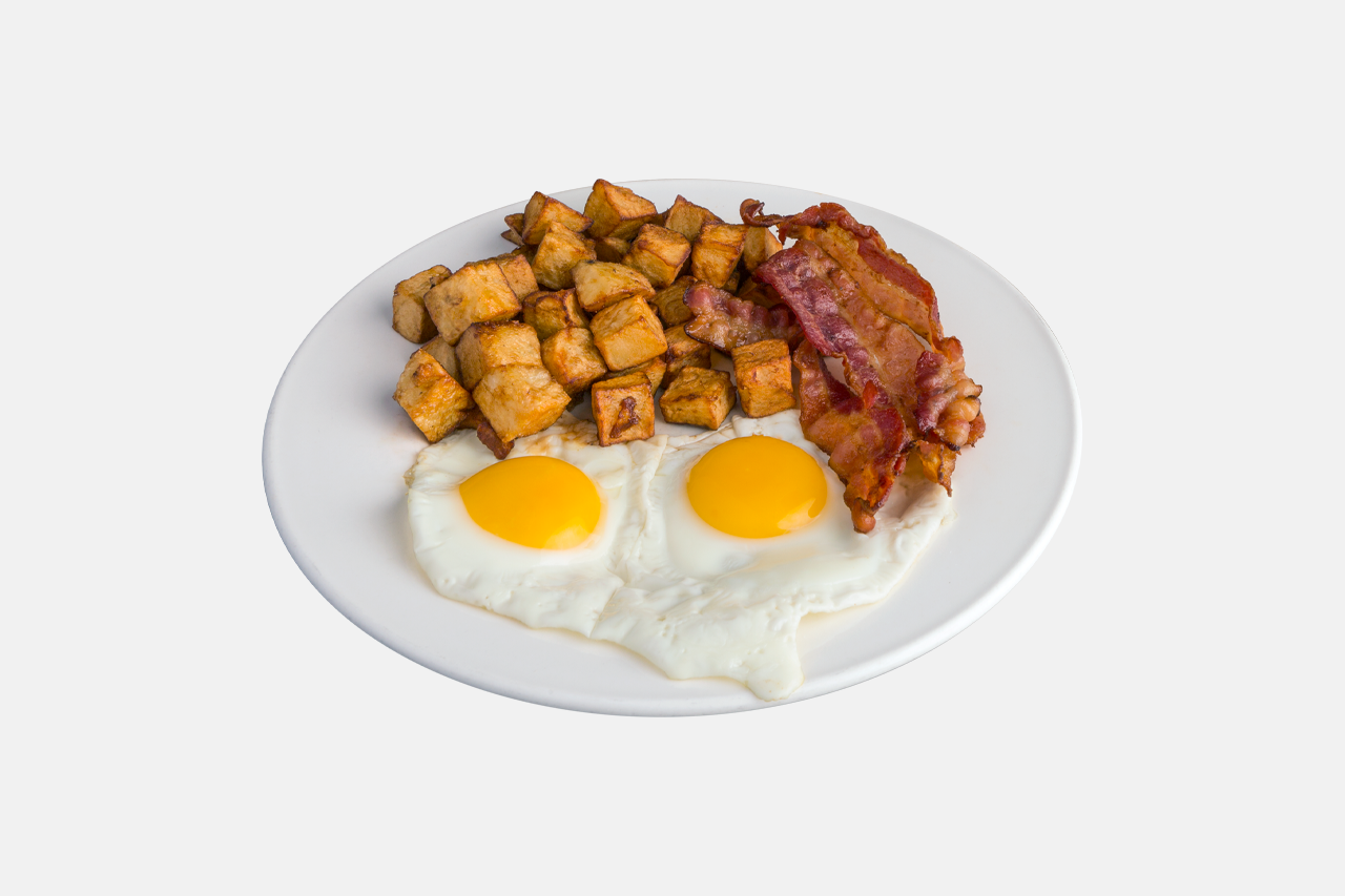 Deux œufs à votre goût et bacon, jambon, saucisse ou mortadelle frite. Servis avec des pommes de terre rissolées et du pain grillé. | ![]()