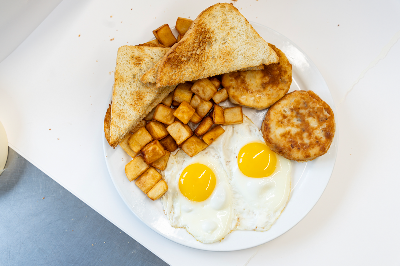 Deux croquettes de poisson, deux œufs, pommes de terre rissolées et pain grillé. | ![]()