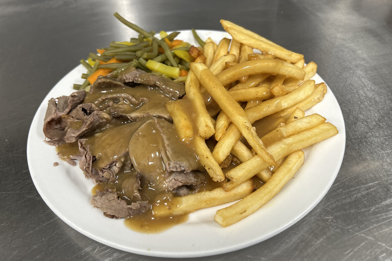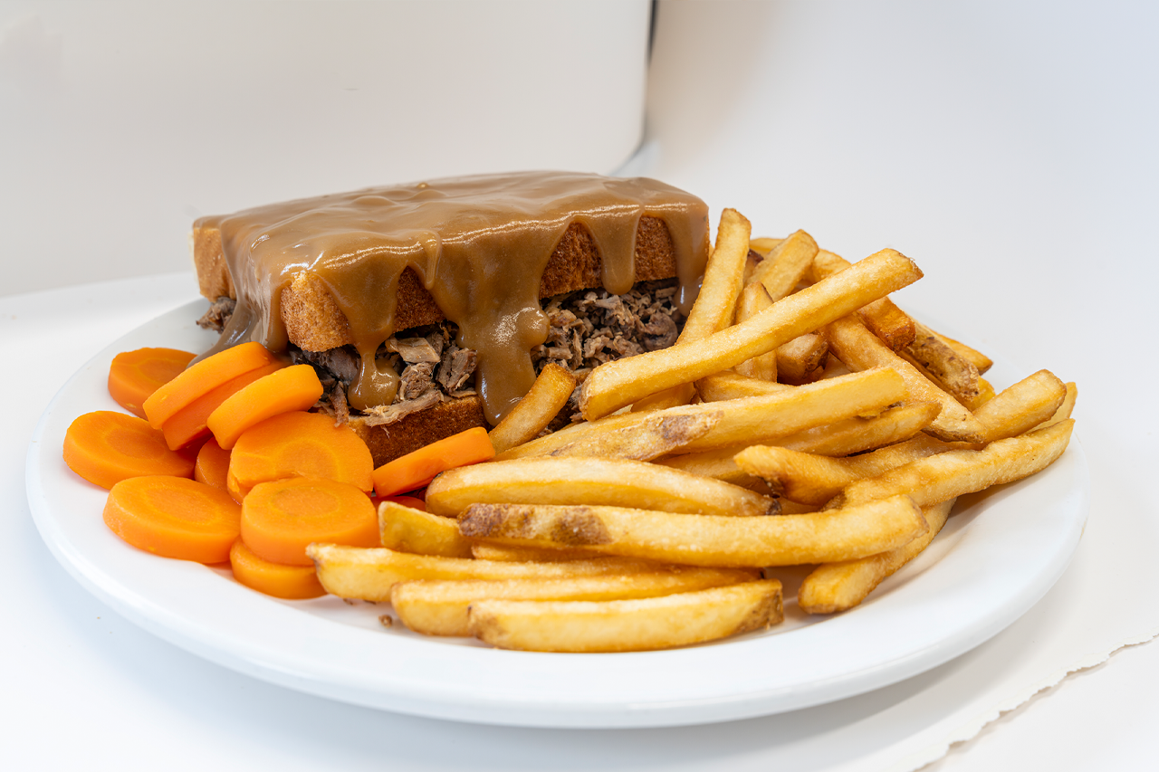 Bœuf haché saisi servi entre deux tranches de notre pain maison et nappé de sauce. Servi avec des frites ou de la purée de pommes de terre, et des légumes. |