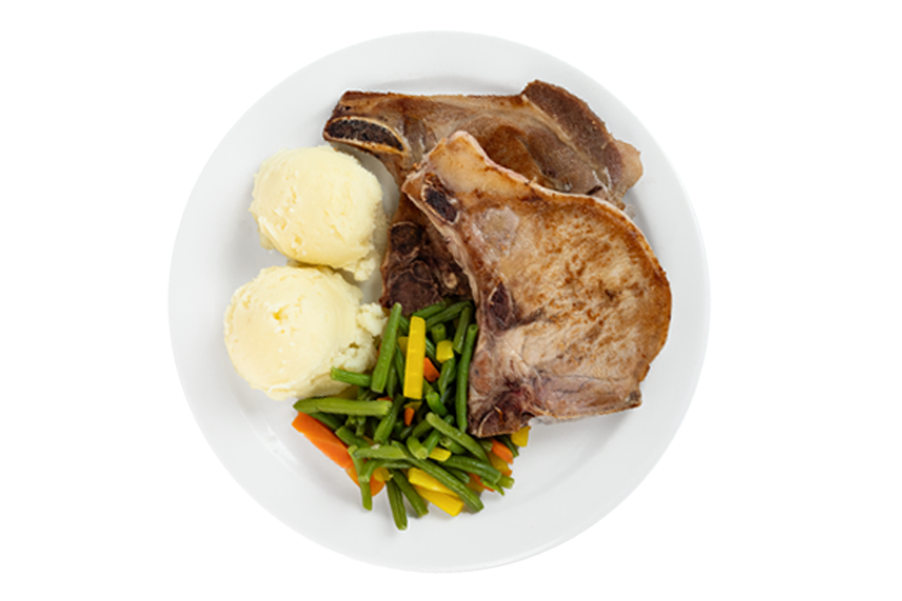 Deux côtelettes de porc (coupe du centre) assaisonnées • Gravy and onions add 2.49 | ![]()