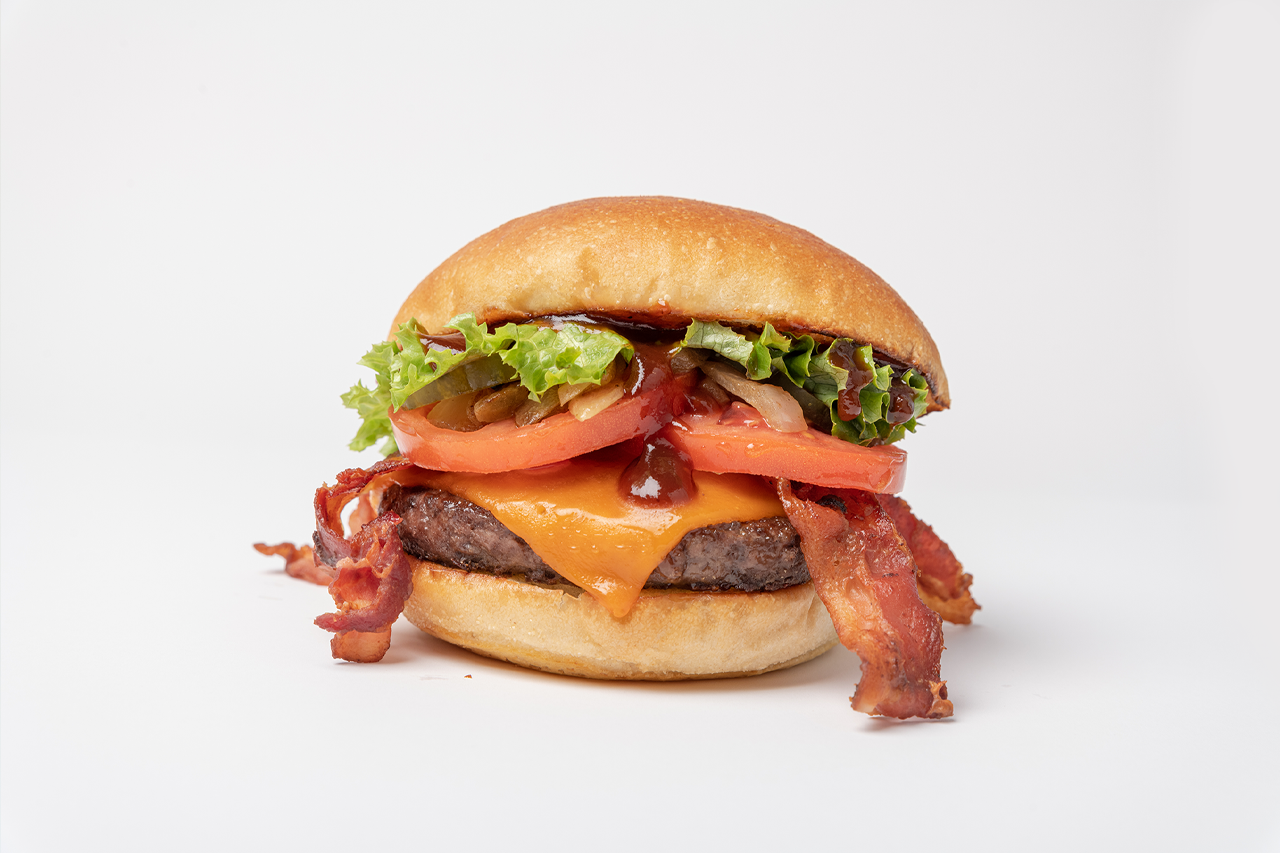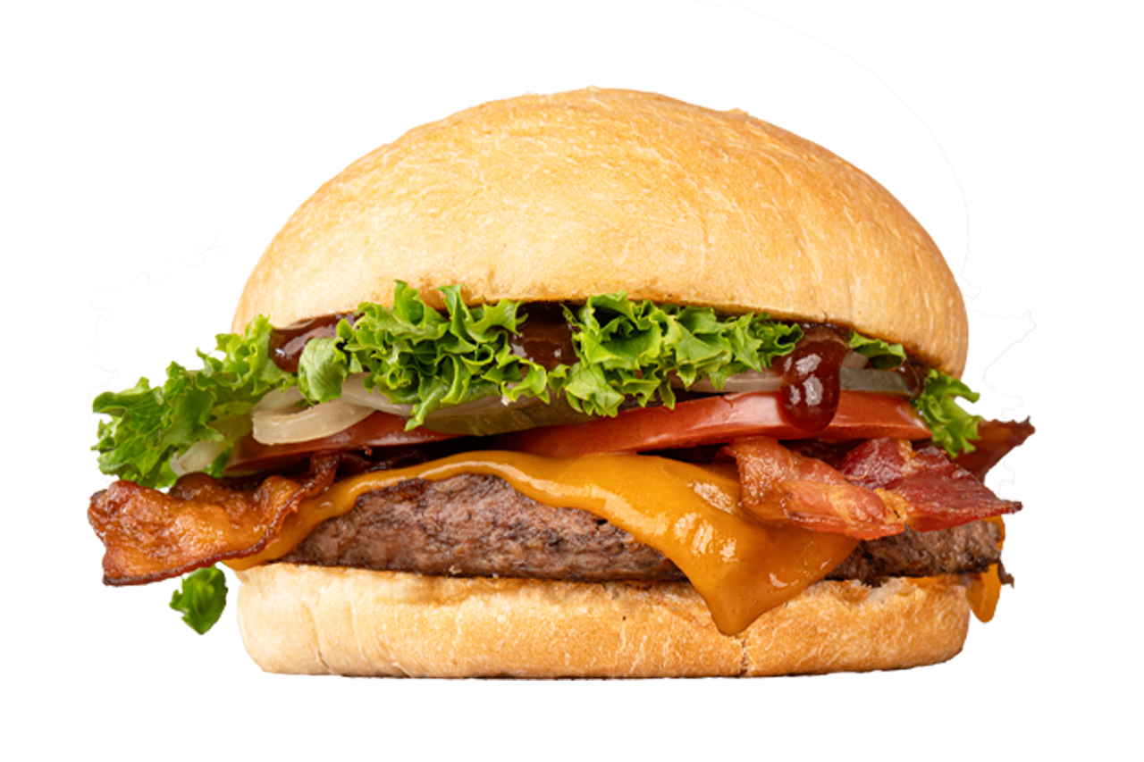Savourez notre galette de bœuf assaisonnée garnie de fromage cheddar, d’oignons sautés, de bacon, de laitue, |