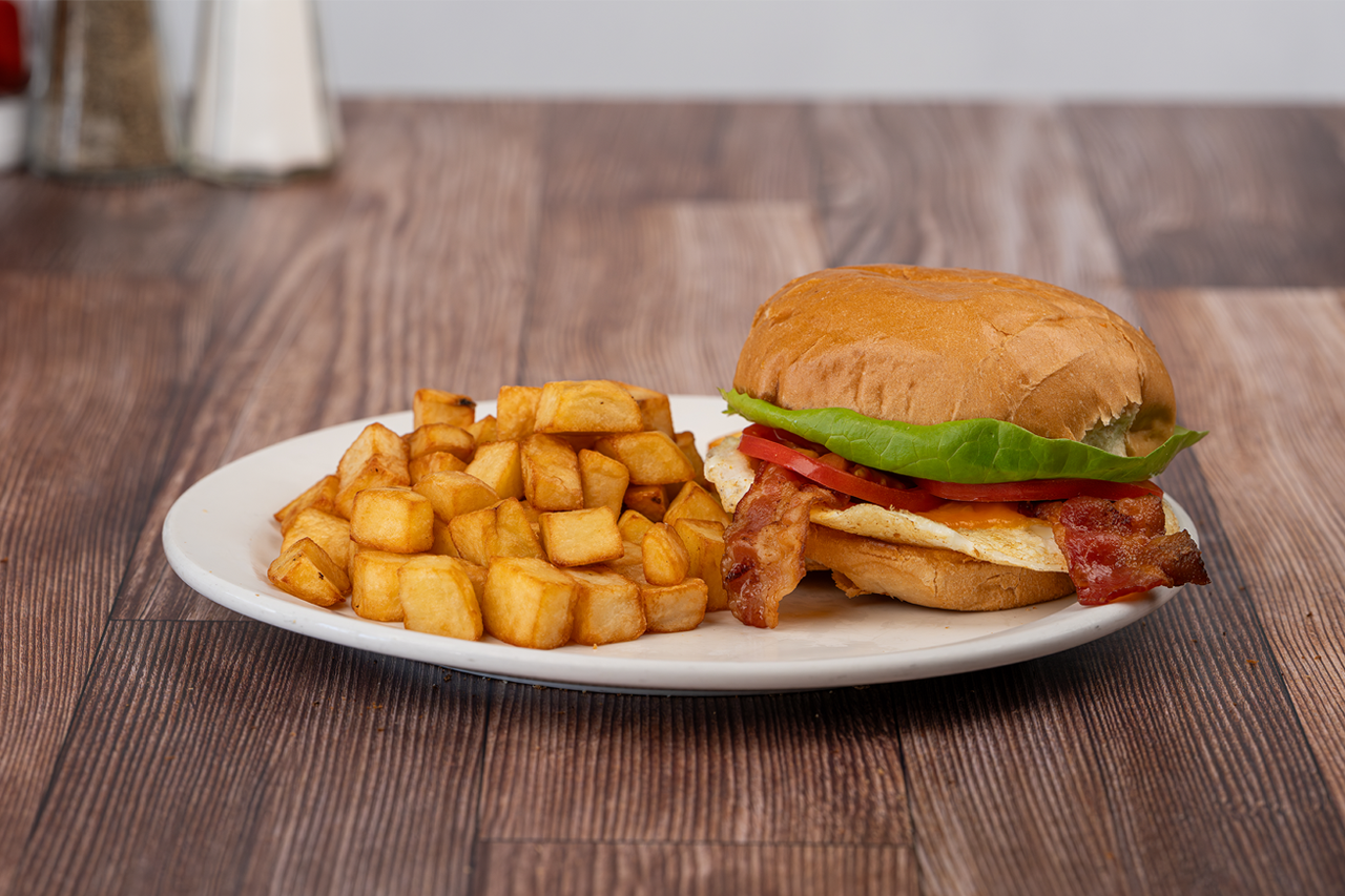 Sandwich western traditionnel avec œuf, jambon, poivrons verts et oignons. Servi avec des pommes de terre rissolées. |