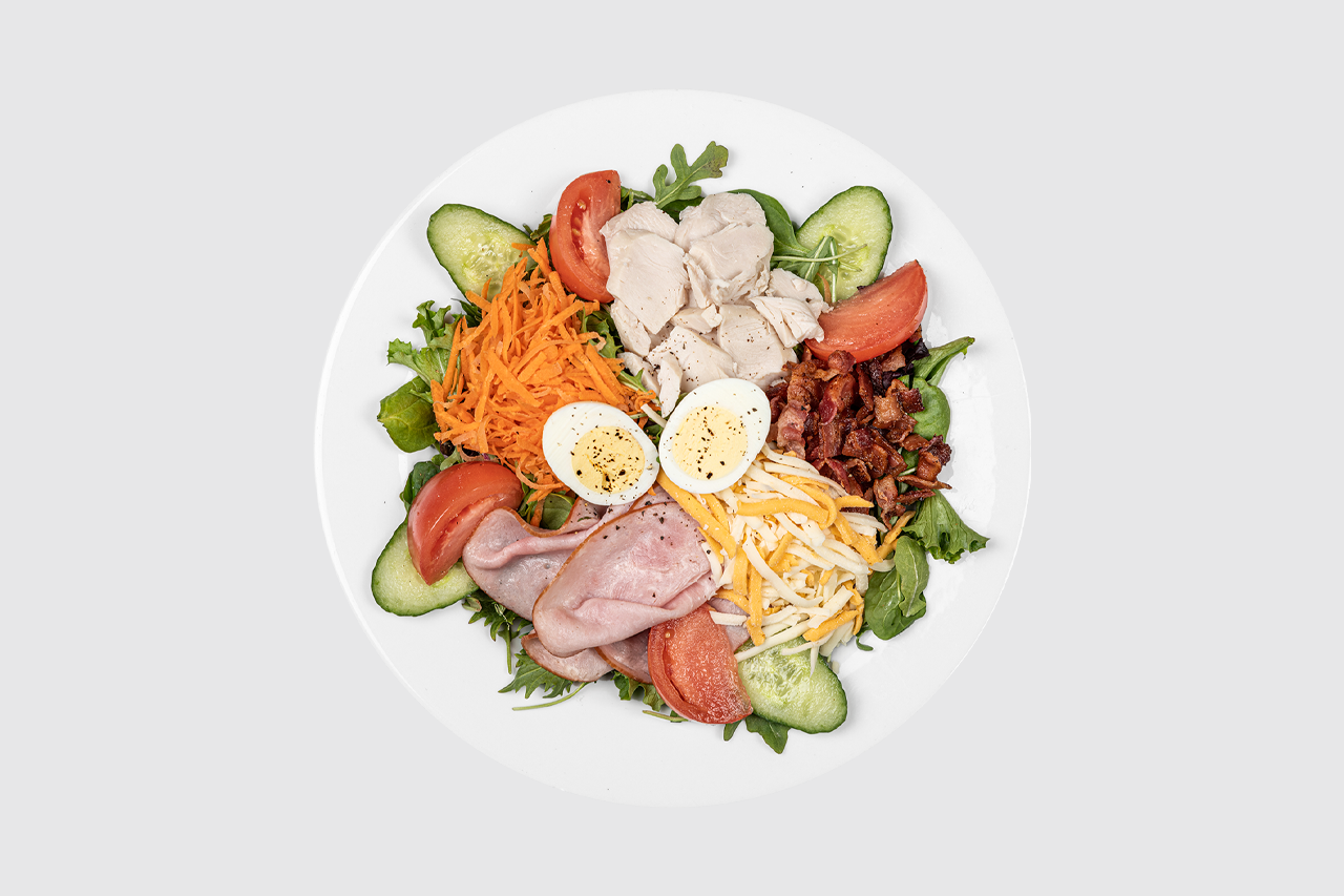 Mélange de verdures avec de la dinde, du jambon émincé, du bacon, un œuf cuit dur, des concombres, des tomates, des carottes râpées et du fromage. |