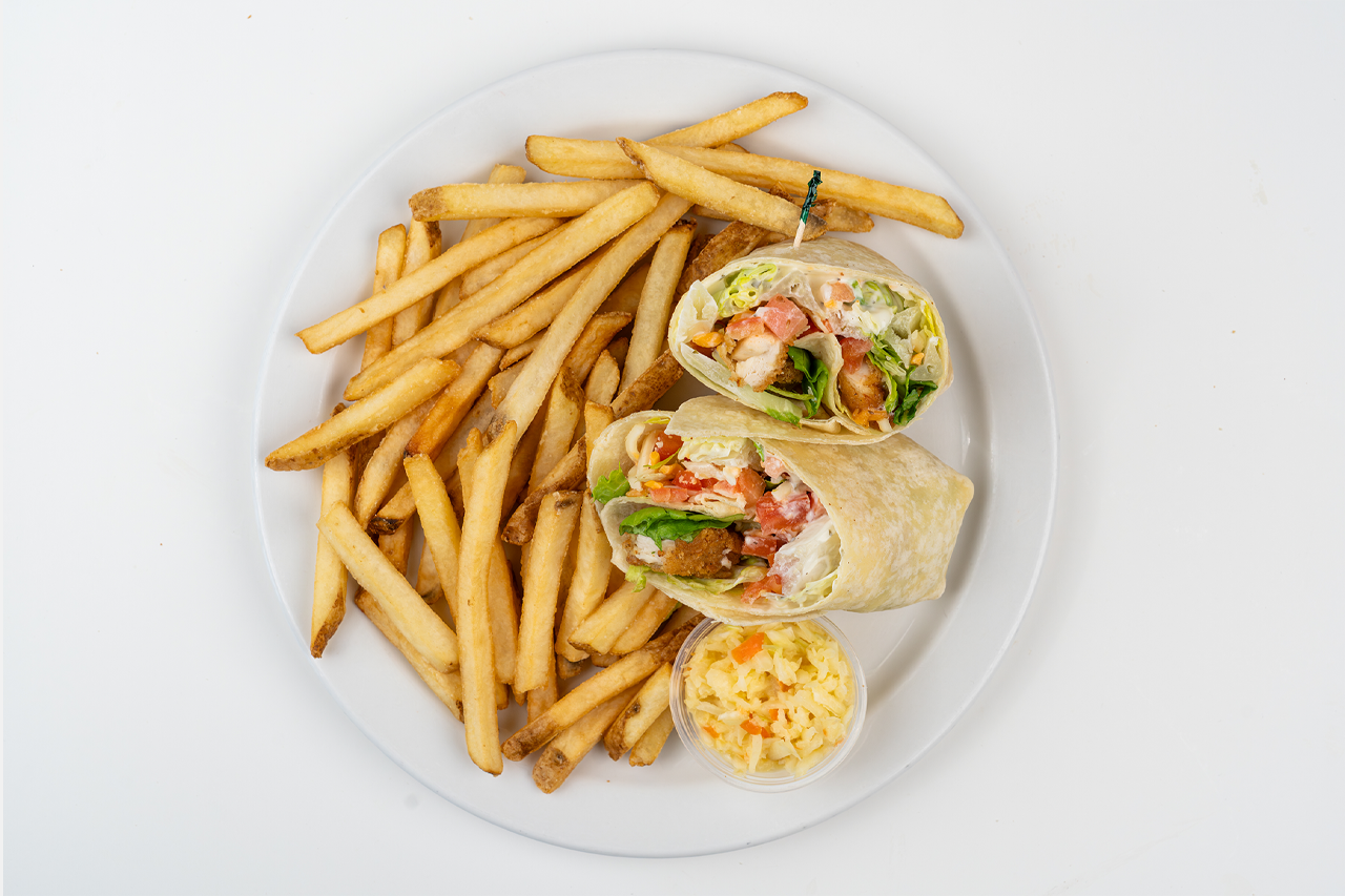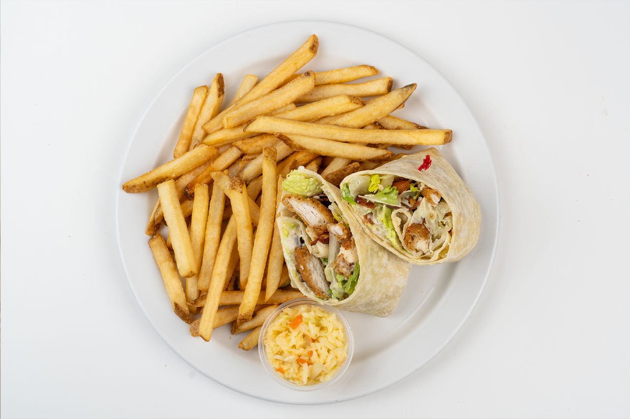 Tortilla à la farine de blé tendre remplie de poulet croustillant, de laitue, de tomates, de fromage et de vinaigrette ranch crémeuse. Servie avec des frites et de la salade de chou. | ![]()
