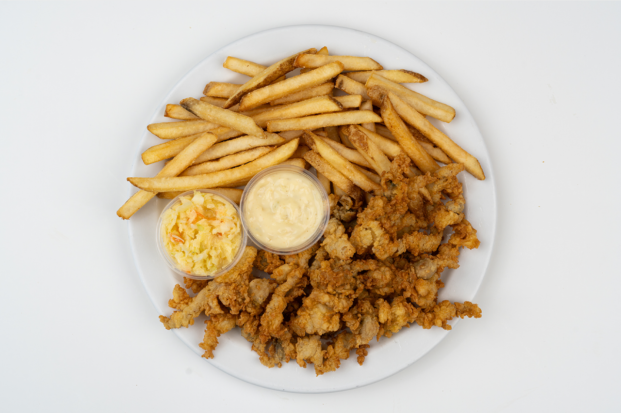 Palourdes entières légèrement panées et frites. Servies avec des frites et de la salade de chou. Offertes selon la | ![]()