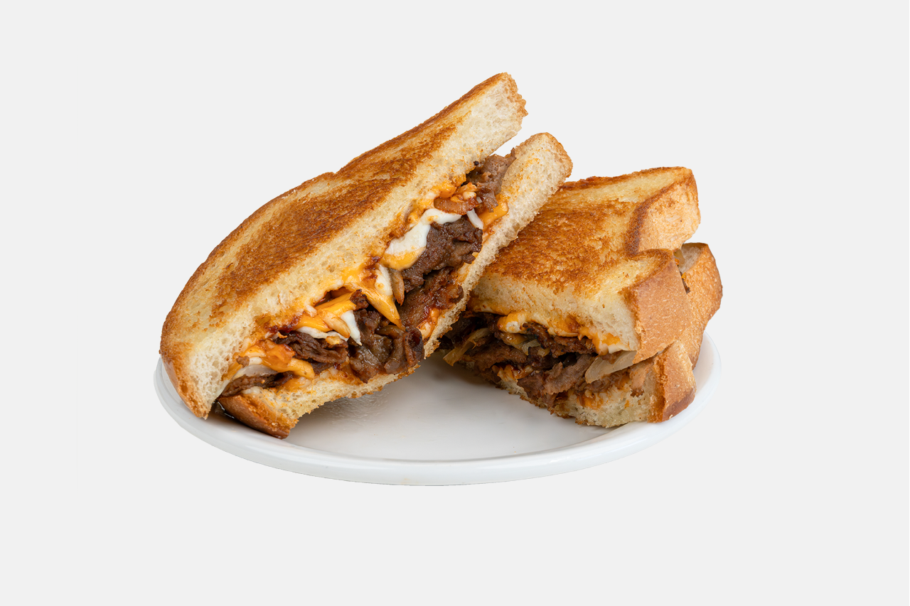 Galette de bœuf assaisonnée écrasée entre deux tranches épaisses de pain beurré grillé, garnie d’oignons sautés, de mayonnaise, de moutarde et de deux tranches de cheddar. |