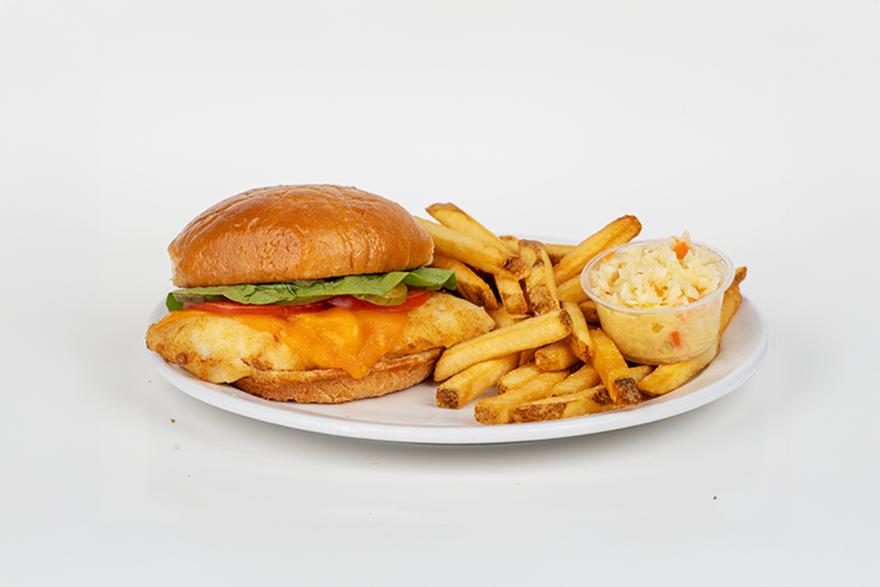 Morue légèrement panée garnie de cheddar fondu, de laitue, de tomates, de cornichons et de sauce tartare. Le tout est servi avec des frites et de la salade de chou. | ![]()