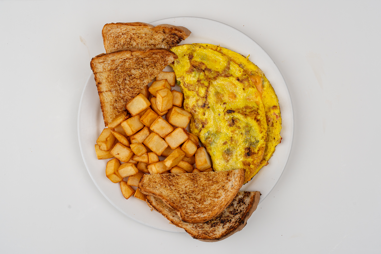 choisissez parmi la Big Stop (17,49), l’omelette des amateurs de viande (17.99) ou la végé (14.99). Servie avec des pommes de terre rissolées et du pain grillé. |
