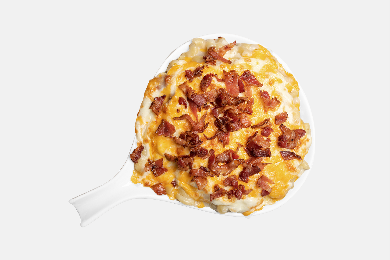 Macaronis cuits dans une sauce crémeuse au bacon et au fromage, le tout garni de chapelure, de trois sortes de fromage et de beaucoup de bacon croustillant. S’accompagne de pain à l’ail | ![]()