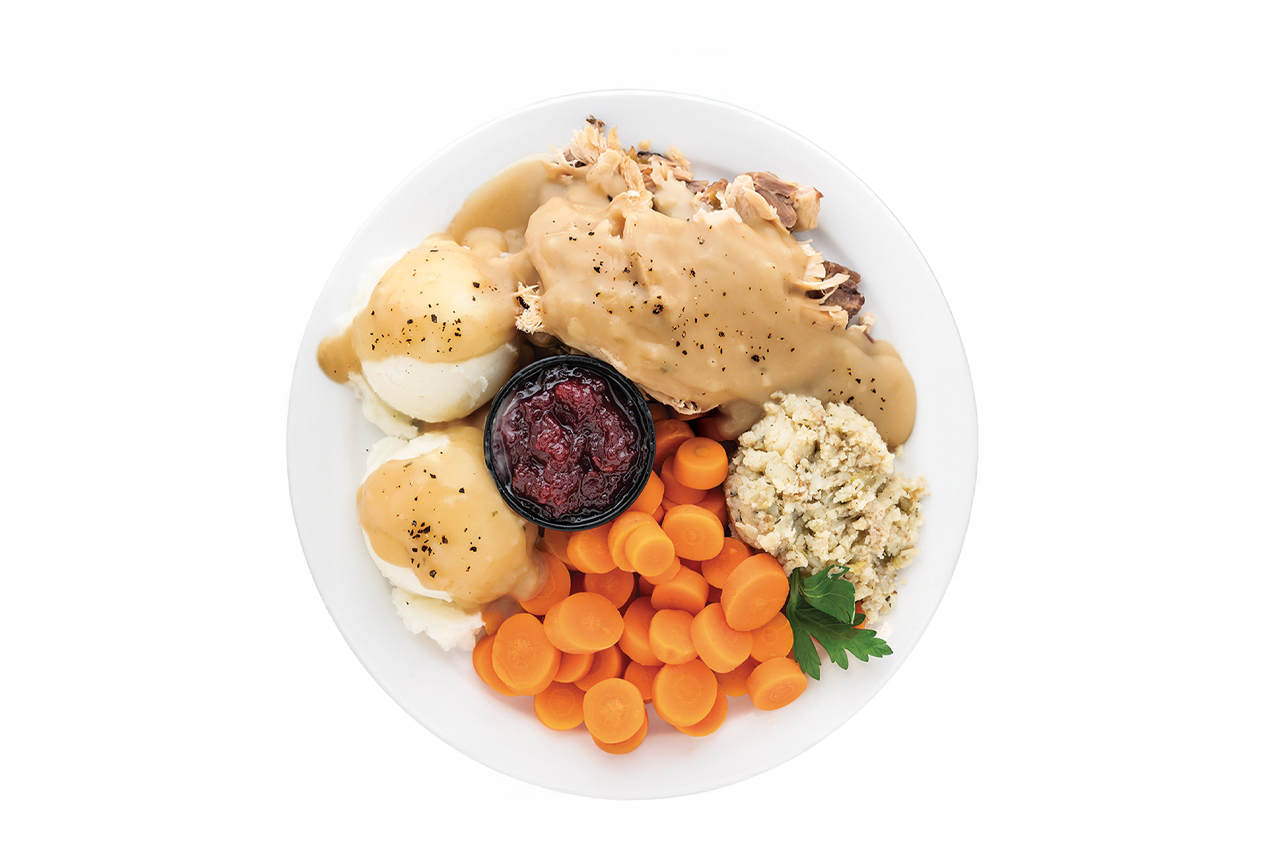 Tranches de dinde rôtie au four recouvertes de farce savoureuse et de sauce maison. Servies avec de la sauce aux canneberges, de la purée de pommes de terre et des légumes. • Viande blanche seulement, ajouter 3.49 | ![]()
