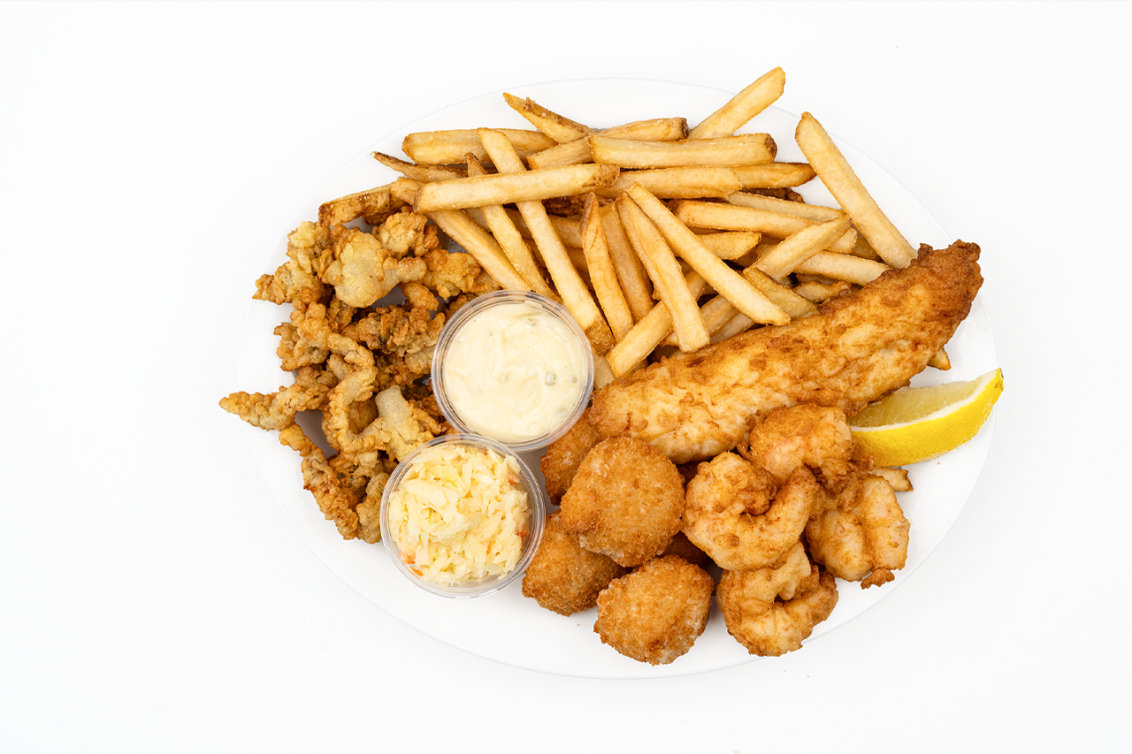 Filet de morue légèrement pané et poulet frit croustillant. Servis avec des frites et de la salade de chou. | ![]()