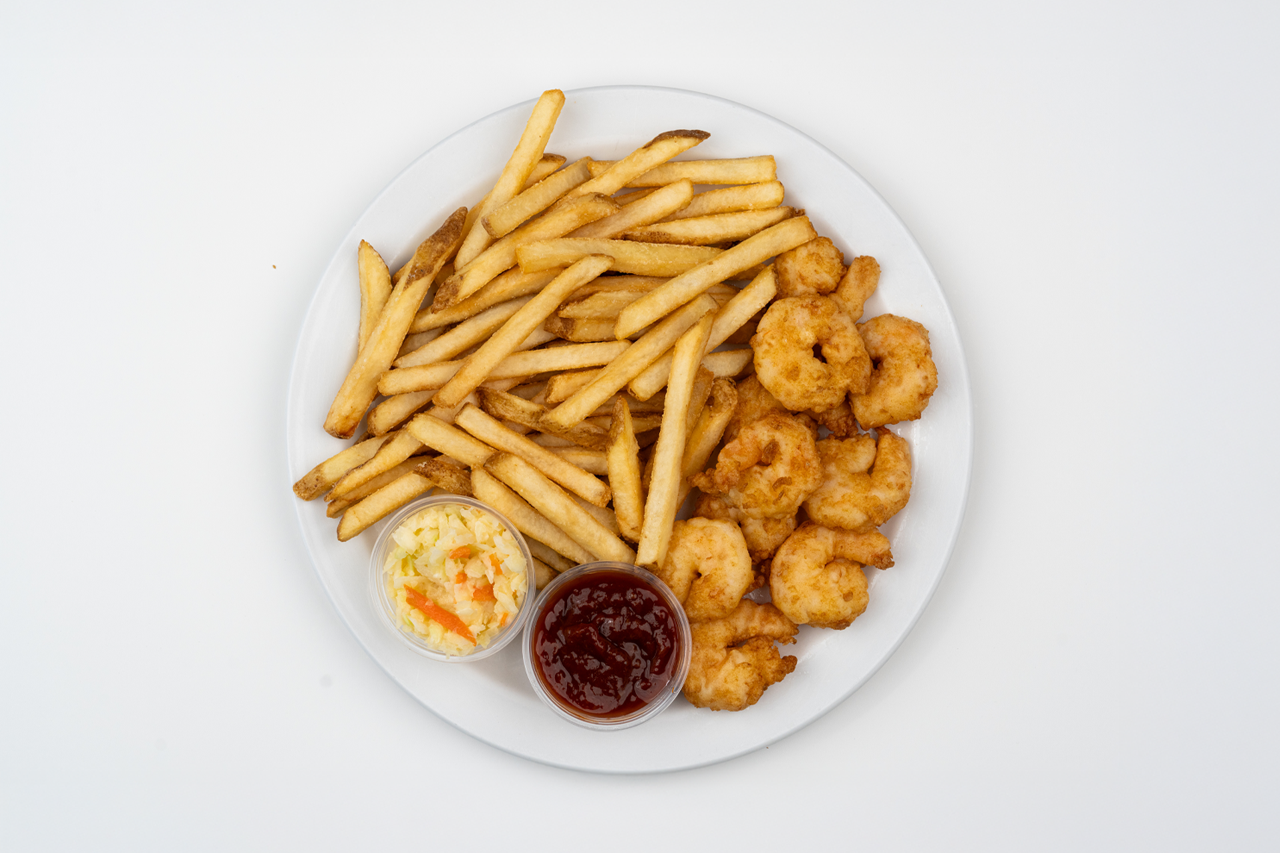 Crevettes assaisonnées et légèrement panées. Servies avec des frites et de la salade de chou. |