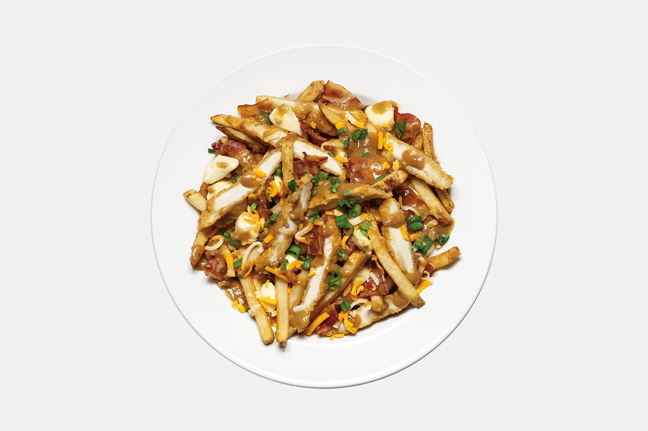 Jambon, bacon ou saucisse avec des oignons, des poivrons verts, des champignons et des tomates servis sur des pommes de terre rissolées et recouverts de deux œufs, le tout nappé de fromage cheddar fondu ou de | ![]()
