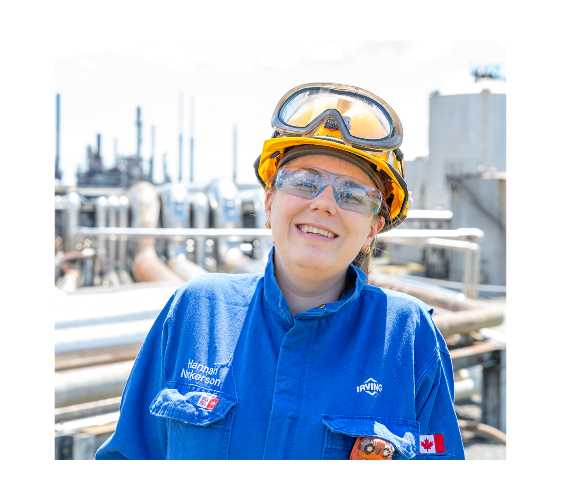 Hannah is an engineer with Irving Oil’s Process Engineering Group. She enjoys a mix of field work and desk work, while working with a diverse team. Hannah uses her math and chemistry skills to troubleshoot plant operations, develop a solution and execute the plan. This involves participation from many teams. In the field, she might supervise certain activities or climb through equipment to perform inspections. Findings must be captured and communicated through reports and presentations to ensure the equipment continues to operate well.