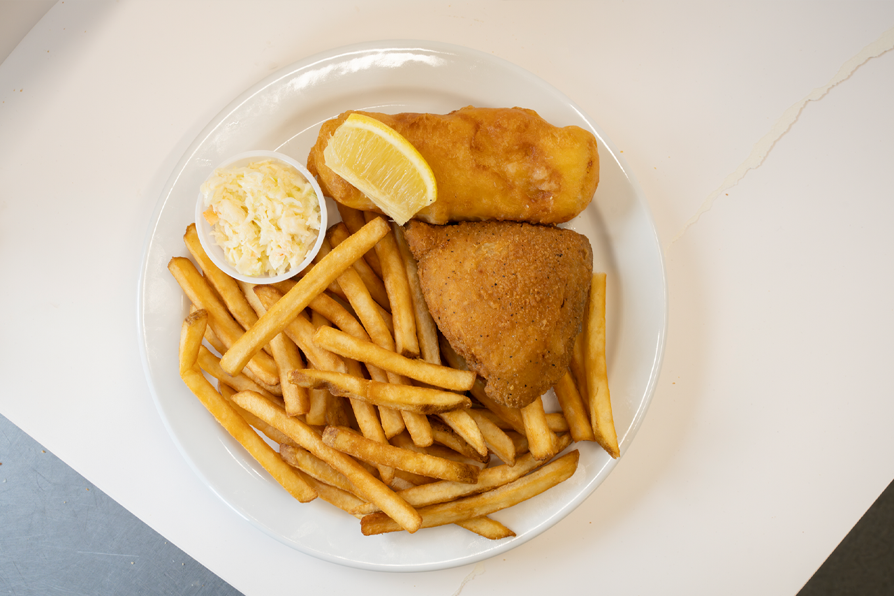 A lightly breaded cod fillet and crispy fried chicken. | ![]()