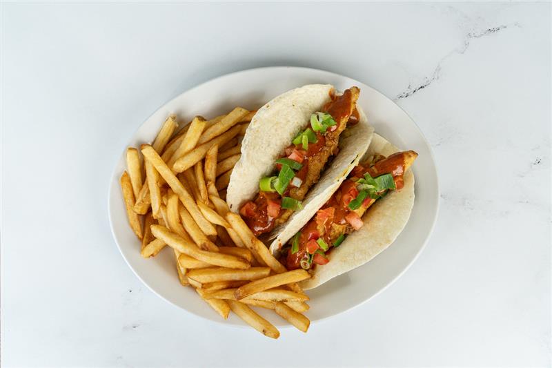 Two soft-shell tacos filled with cilantro-slaw, chopped tomato and cod. Topped with chipotle mayo. Served with fries and coleslaw. |