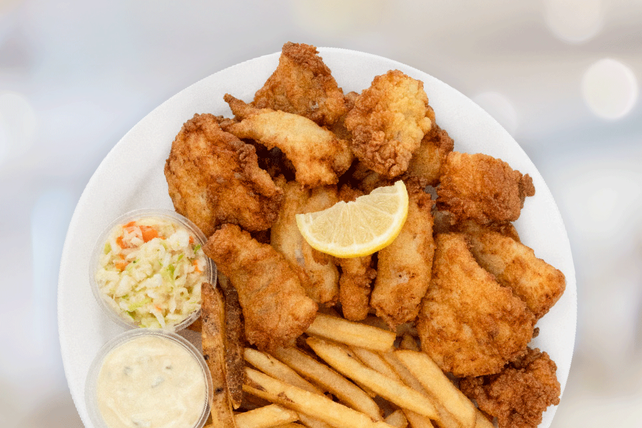 Hand-battered fish. Served with crispy fries and coleslaw.