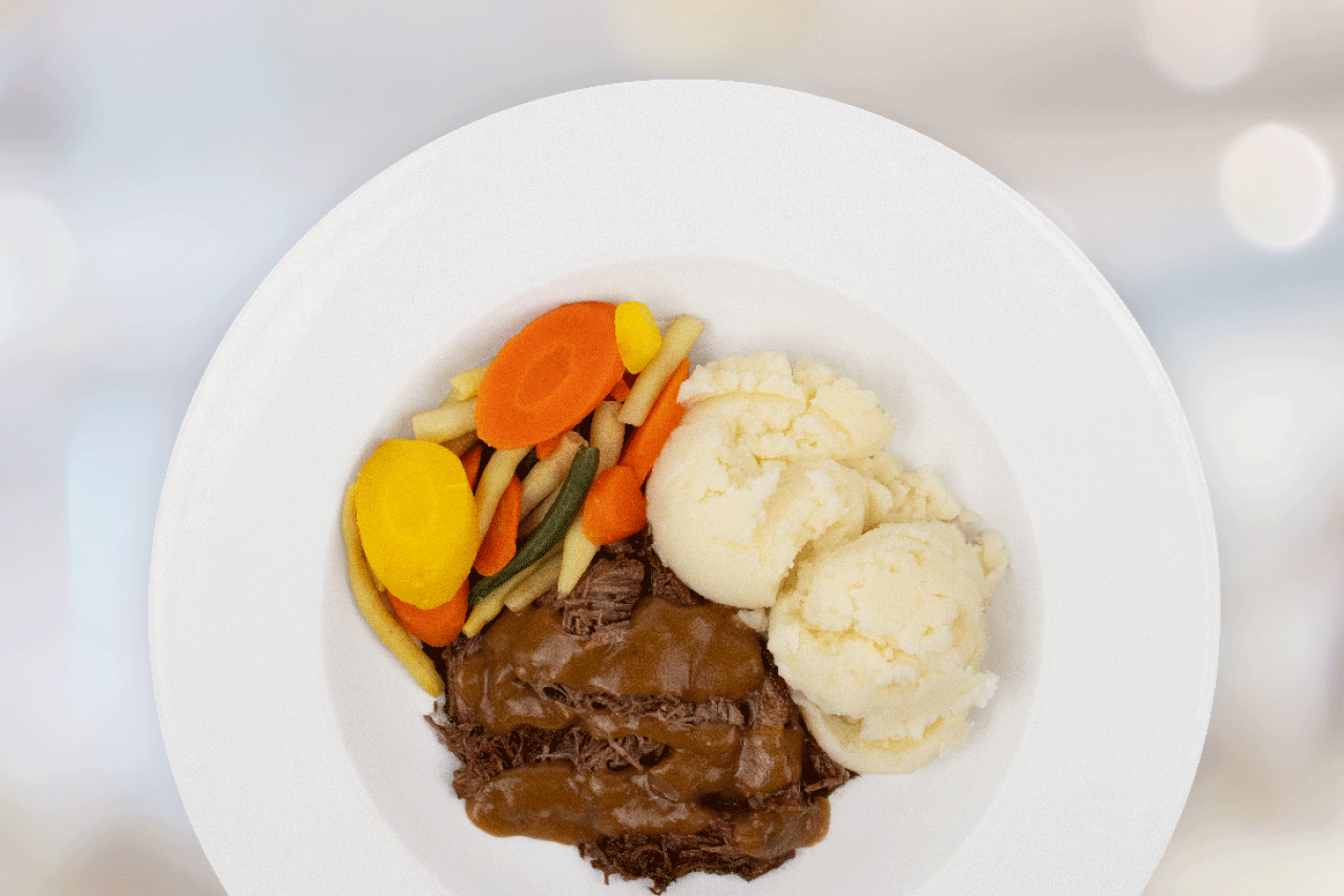 Certified Angus beef slow-roasted with au jus and homestyle gravy. Served with mashed potatoes and vegetables.