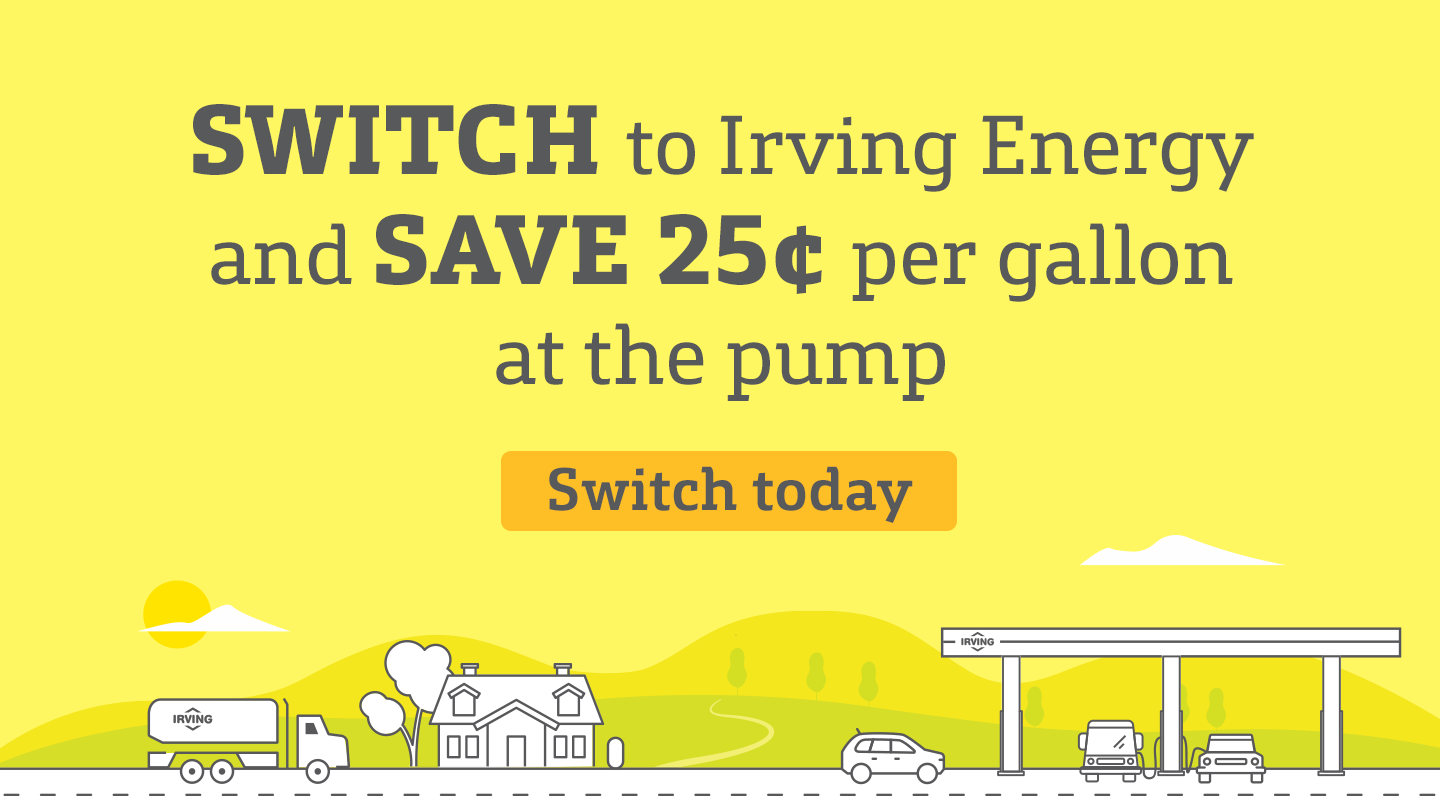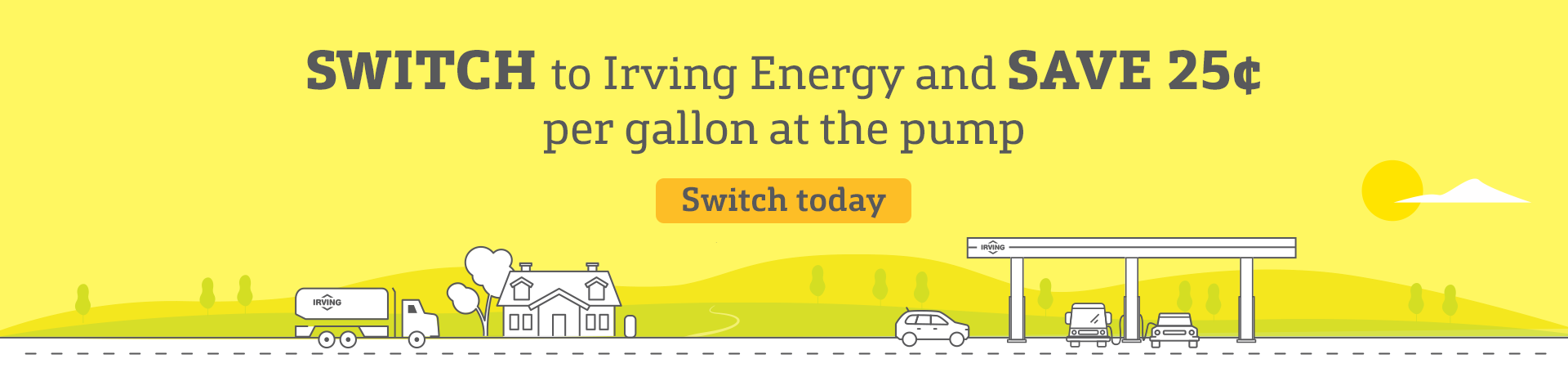 Irving Rewards Offer: Participating customers can save 25¢ per gallon (up to a 20-gallon limit) per visit at participating Irving Oil retail locations for the next 42 visits during the twenty-four (24) month period following their first Irving Energy fuel delivery. Customers must link their registered Irving Rewards Card to their new Irving Energy home heat account.