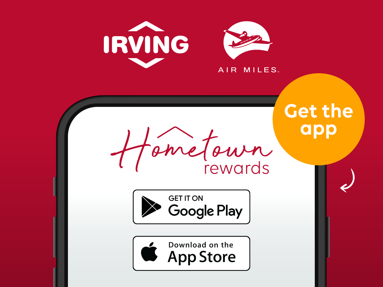 Hometown Rewards members earn a 6¢/L reward to use towards a future fill every time they swipe their AIR MILES card with 35 L or more at Irving.