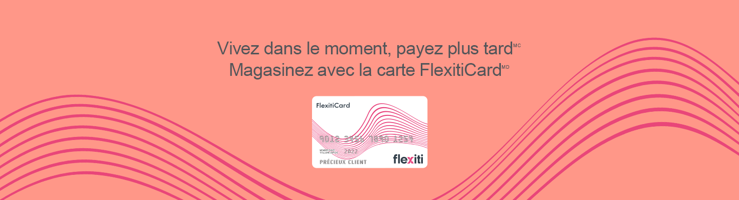 Les avis relatifs aux changements apportés aux promotions et aux modalités seront émis conformément à la législation applicable. Financement arrangé par Flexiti Financière Inc. N° de permis en C.-B. : 83660. Flexiti, Flexiti Wave Card, Réseau Flexiti et tout logo associé sont des marques de commerce de Flexiti Financière Inc.