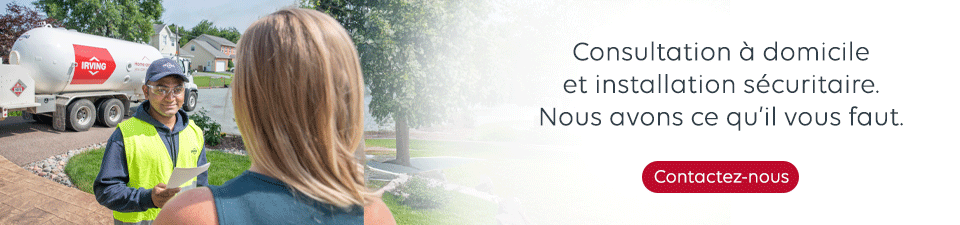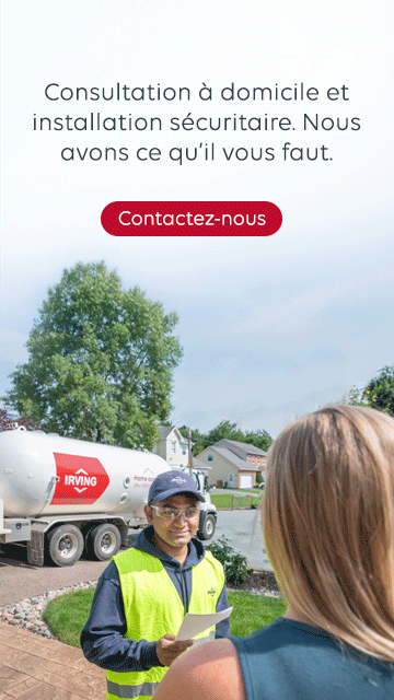 Le propane est une option de chauffage sécuritaire et efficace pour votre maison. Polyvalent, il peut alimenter les appareils ménagers et les génératrices, en plus de servir à l’extérieur de la maison. Lorsque vous optez pour le propane et choisissez Irving comme fournisseur, vous obtenez la livraison automatique et l’installation gratuite de votre réservoir.