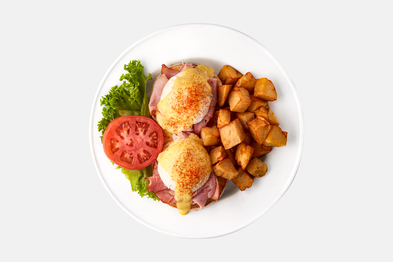 Muffin anglais grillé avec deux œufs pochés, du jambon émincé et une sauce hollandaise. Servis avec des pommes |