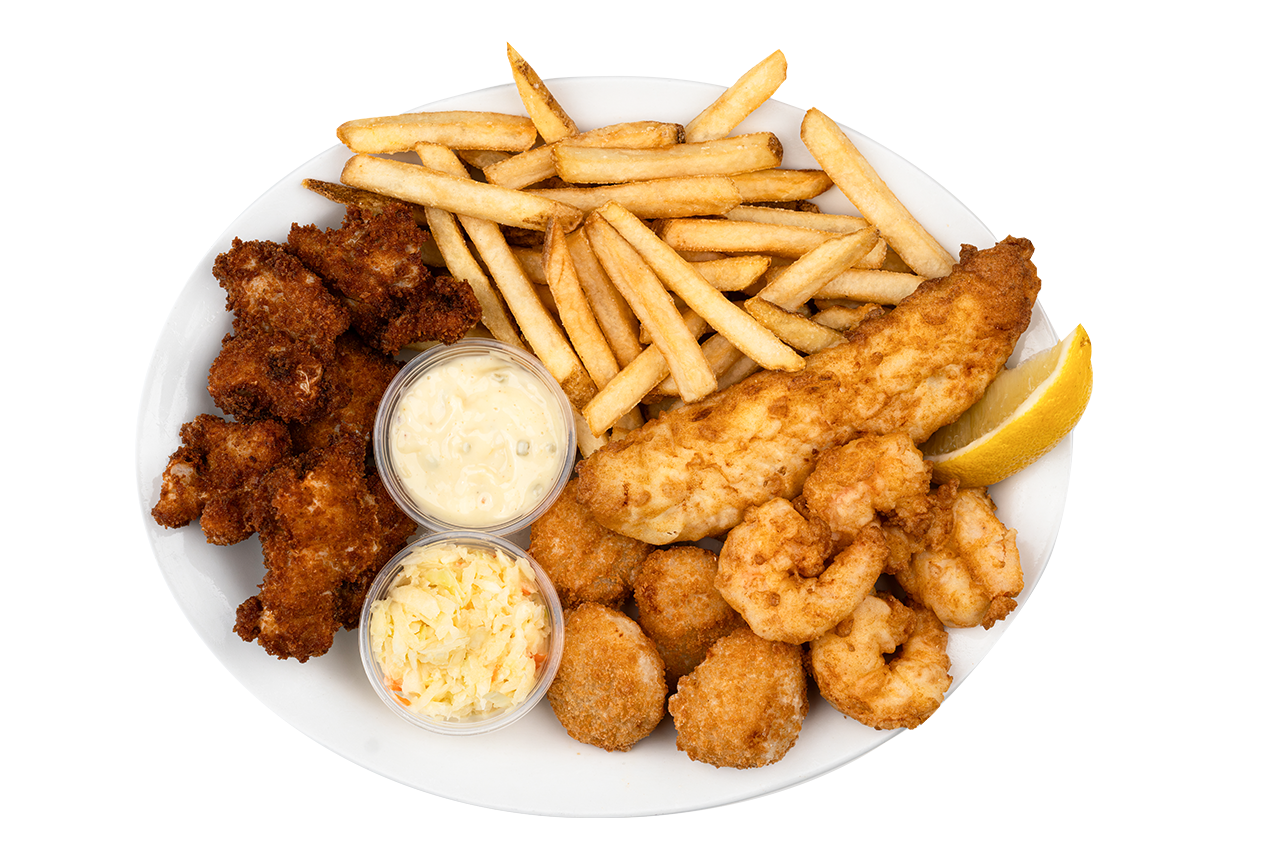 Filet de morue légèrement pané et poulet frit croustillant. Servis avec des frites et de la salade de chou. | ![]()