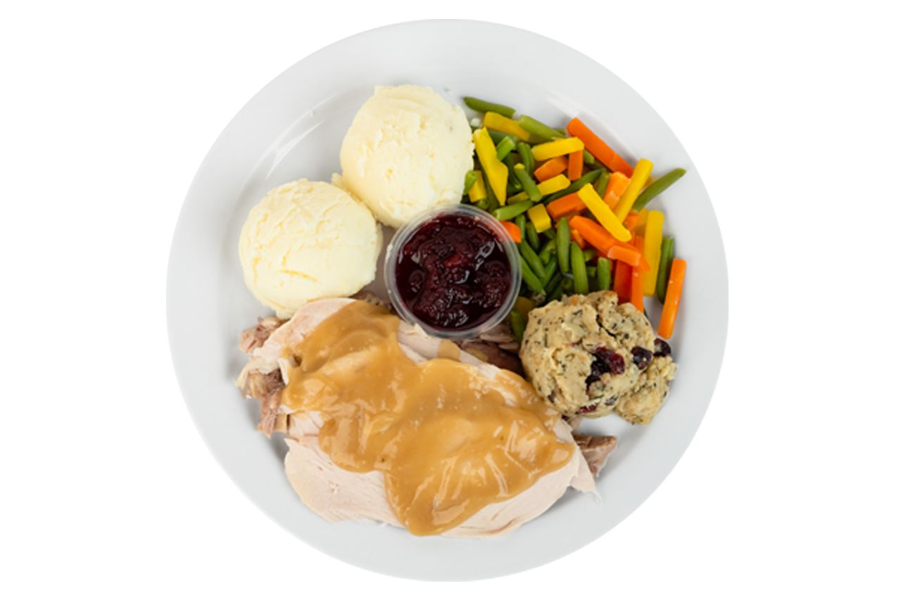 Tranches de dinde rôtie au four recouvertes de farce savoureuse et de sauce maison. Servies avec de la sauce aux canneberges, de la purée de pommes de terre et des légumes. • Viande blanche seulement, ajouter 3.49 | ![]()