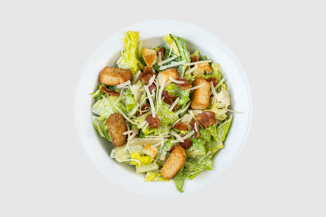 Laitue romaine nappée de vinaigrette César crémeuse, de fromage parmesan, de bacon croustillant et de croûtons. Servie avec du pain à l’ail.