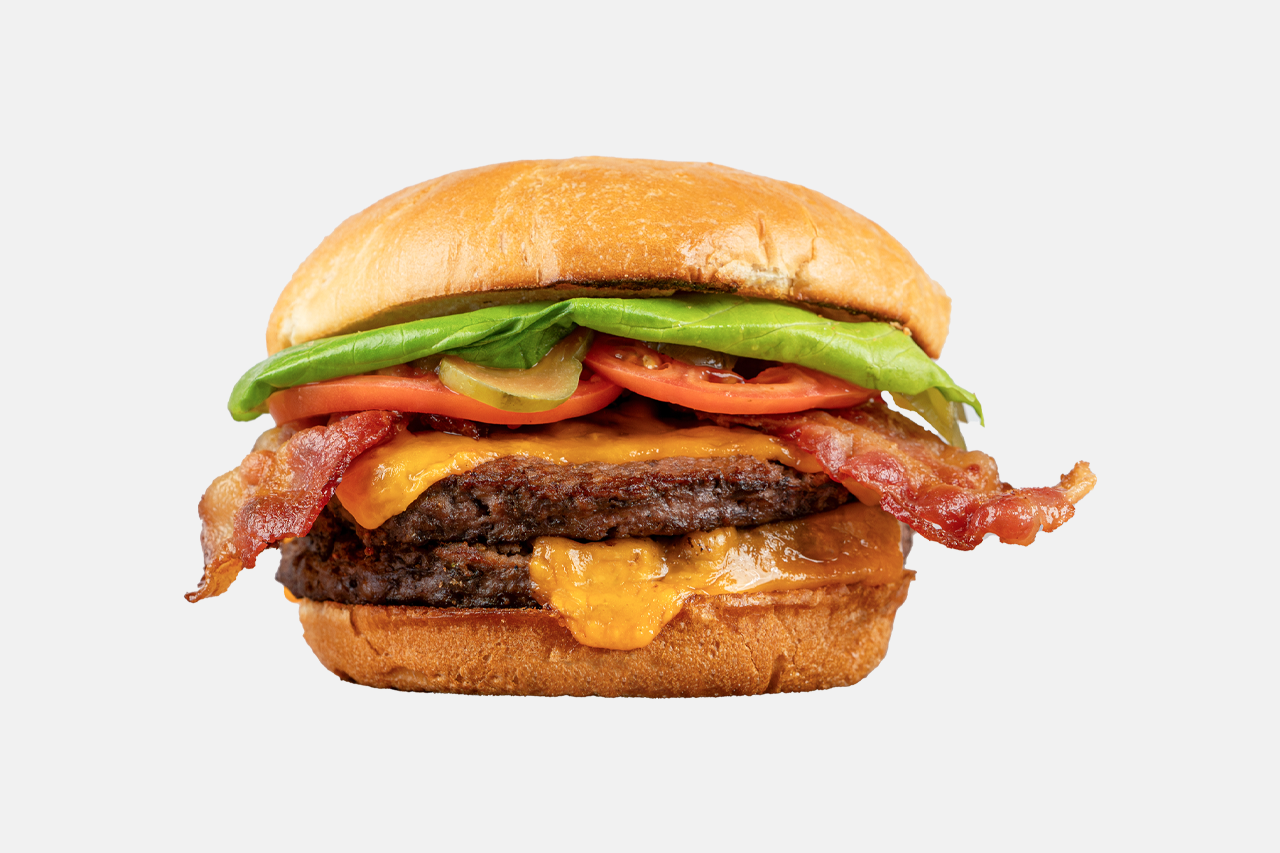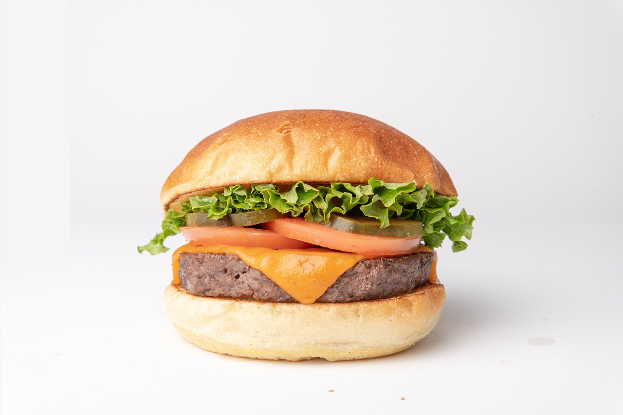 Galette de bœuf assaisonnée garnie de fromage cheddar, de laitue, de tomates et de cornichons. | ![]()