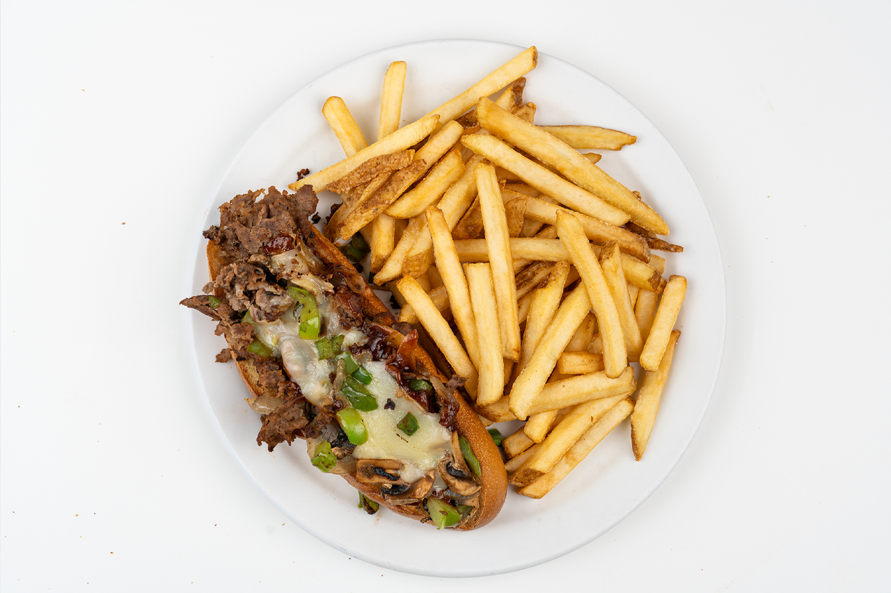 Steak finement tranché recouvert d’oignons, de poivrons et de champignons sautés, ainsi que de fromage Monterey Jack épicé. Le tout est nappé de sauce BBQ piquante, sur un pain de style artisanal beurré et grillé. Servi avec des frites et de la salade de chou. | ![]()