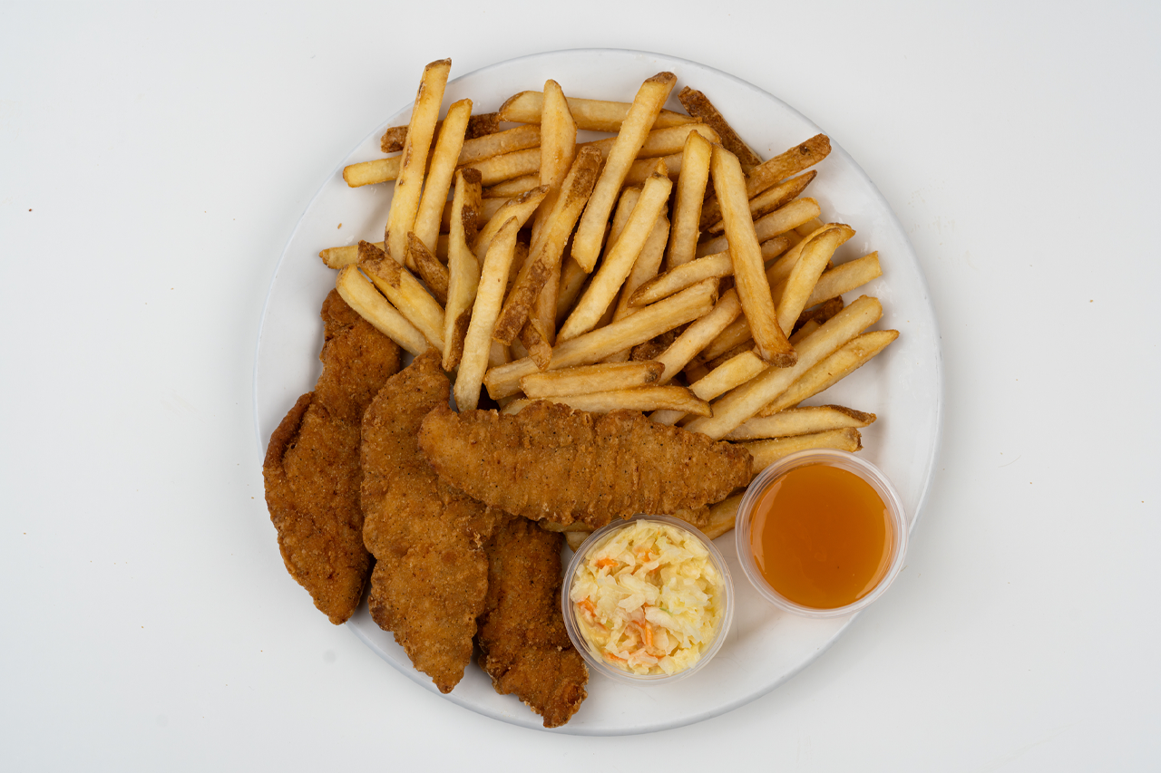 Quatre morceaux de poitrine de poulet panée tendres et bien dorés. Servis avec des frites, de la salade de chou et une trempette. |