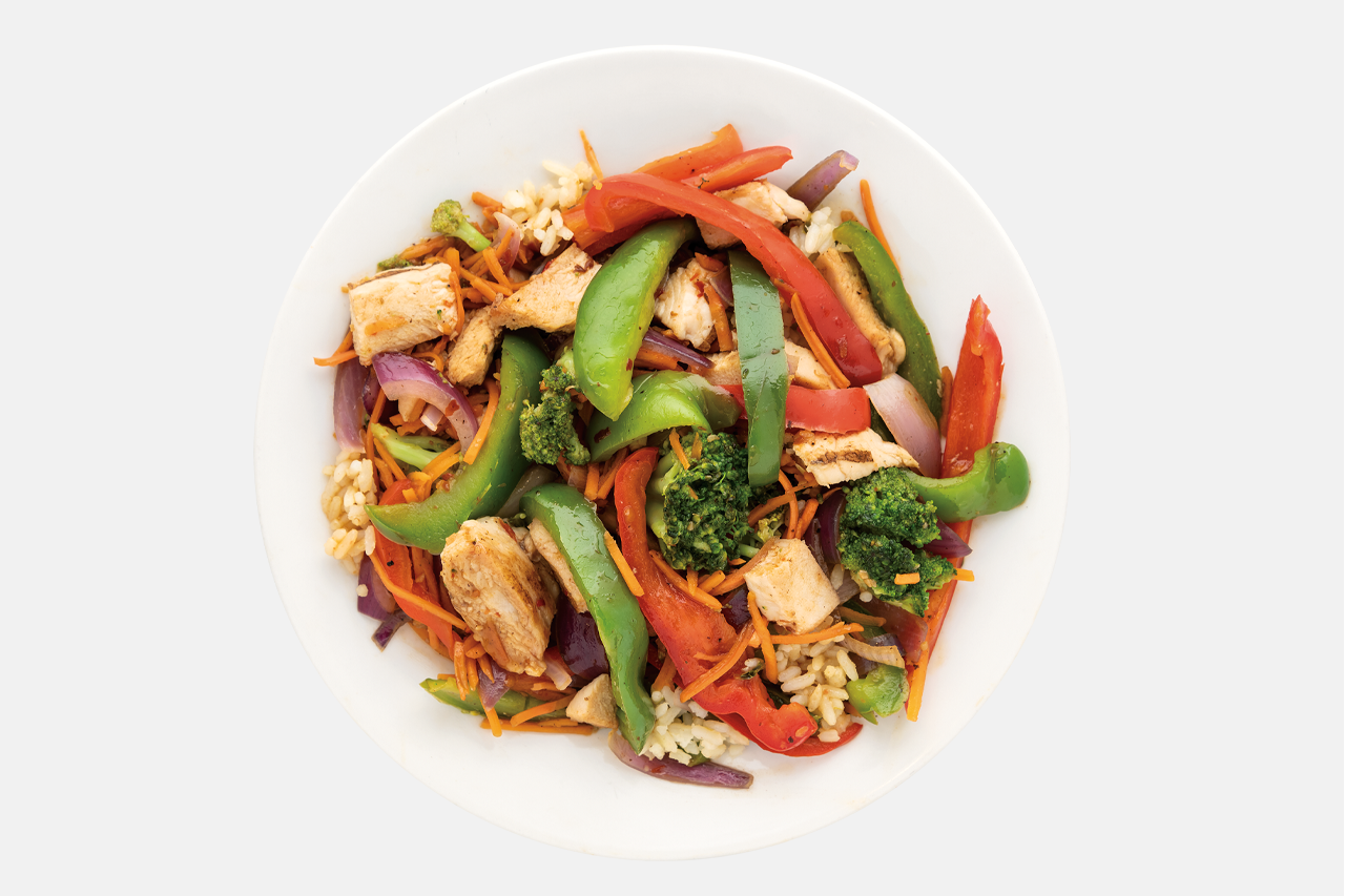 Poulet grillé avec des légumes variés sautés dans une sauce teriyaki ou une sauce chili à la thaï sucrée, servis sur un nid de riz. | ![]()