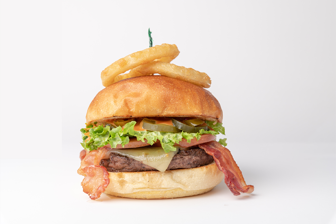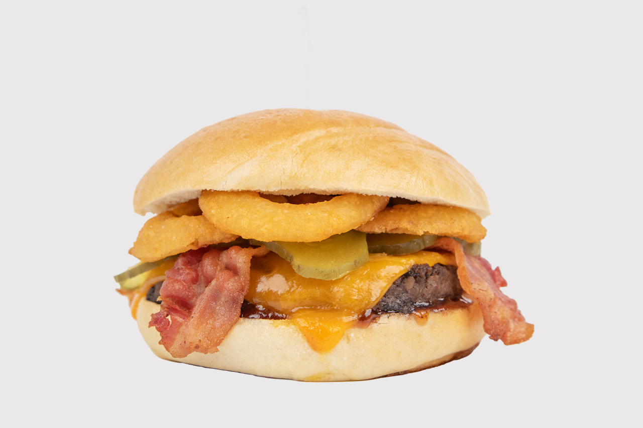 Savourez notre galette de bœuf assaisonnée garnie de fromage cheddar, d’oignons sautés, de bacon, de laitue, |