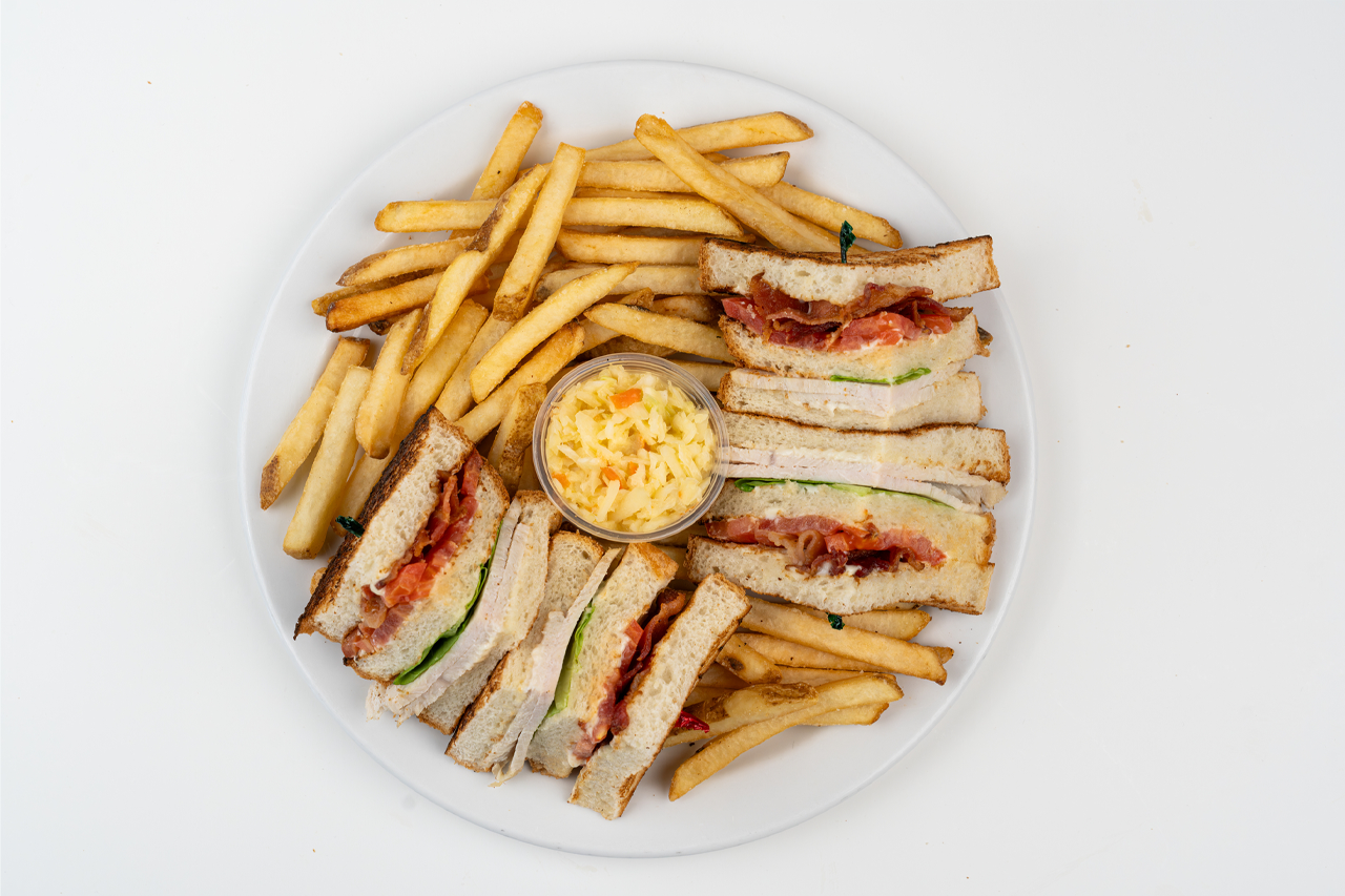 Roasted turkey, bacon, lettuce and tomato stacked high |