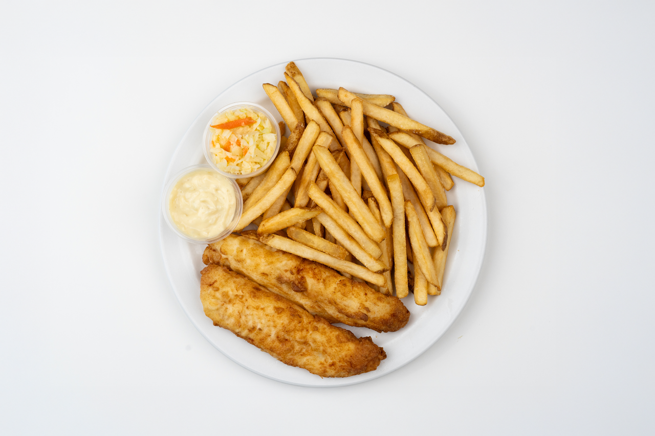 Deux morceaux d’aiglefin légèrement pané servis avec des frites et de la salade de chou. | ![]()