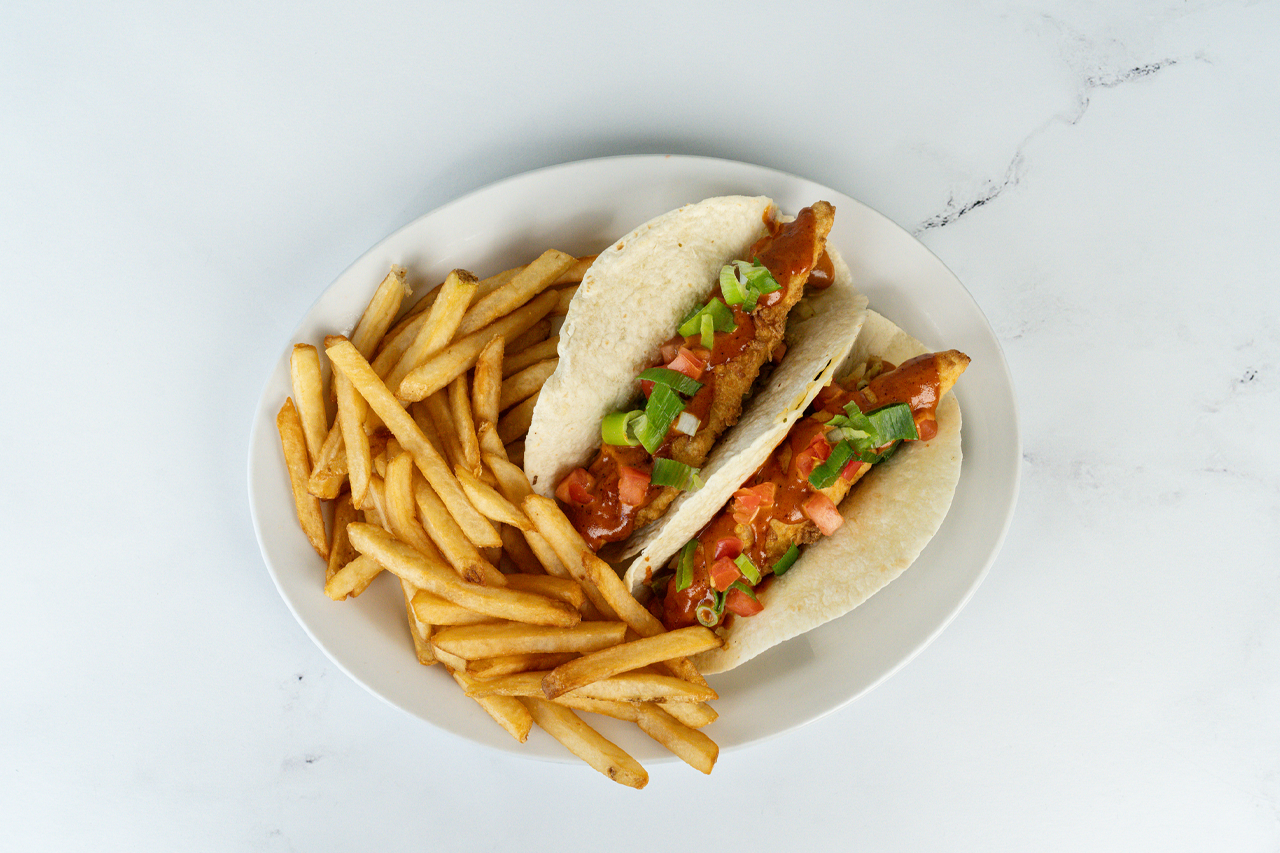 Deux tacos à coquille molle remplis de salade de chou à la coriandre, de tomates et de poisson légèrement pané, le tout agrémenté de mayonnaise au chipotle. Servis avec des frites et de la salade de chou. |
