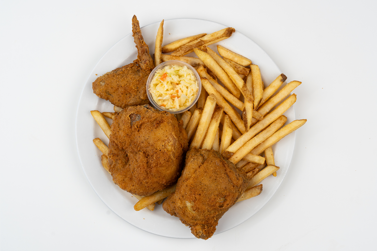 Trois morceaux de poulet légèrement pané bien dorés. Servis avec les pommes de terre de votre choix et de la salade de chou. | ![]()