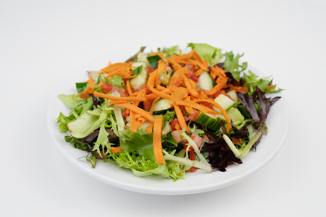 Verdures fraîches accompagnées de tomates, de concombres, de carottes râpées et de la vinaigrette de votre choix.