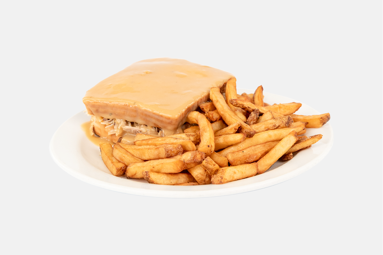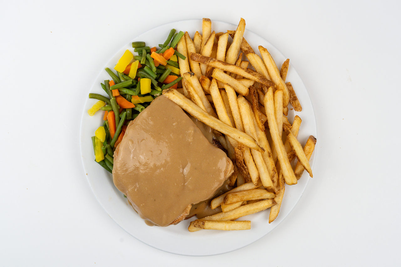 Bœuf haché saisi servi entre deux tranches de notre pain maison et nappé de sauce. Servi avec des frites ou de la purée de pommes de terre, et des légumes. |