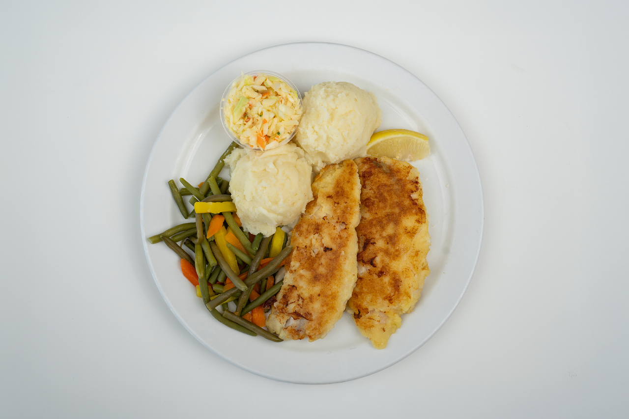 Deux filets de morue légèrement panés, poêlés et servis avec les pommes de terre et les légumes de votre choix. |