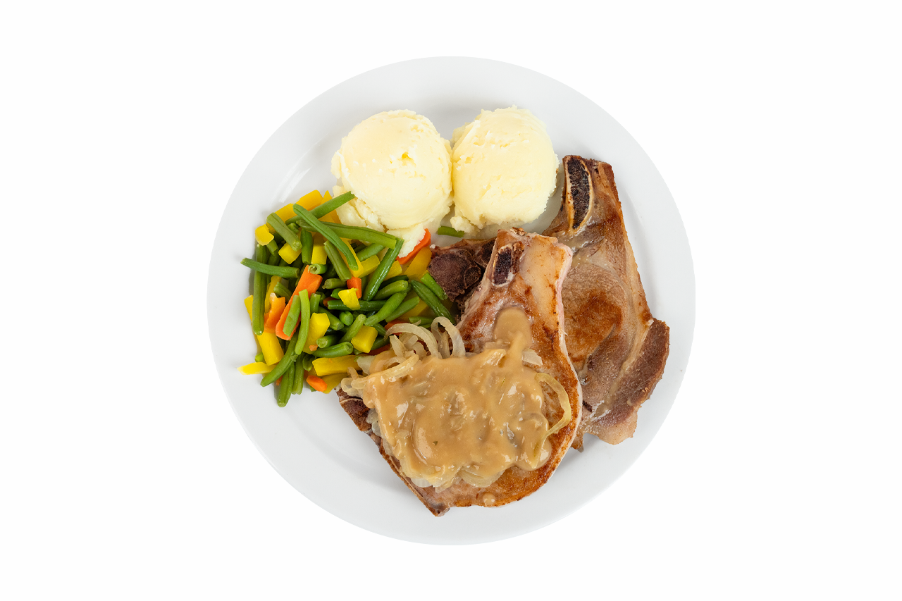Deux côtelettes de porc (coupe du centre) assaisonnées • Gravy and onions add 2.49 | ![]()