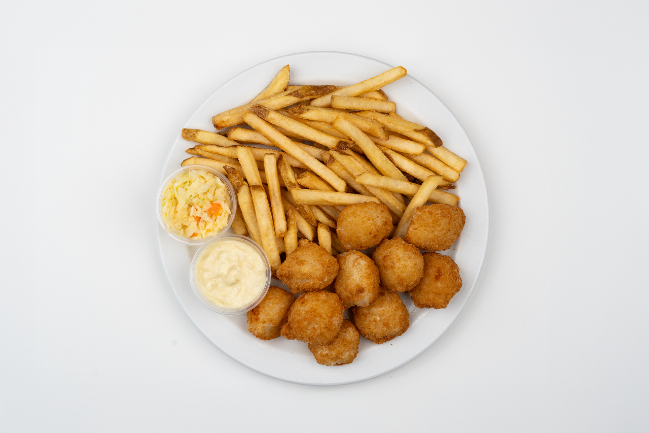 Pétoncles de l’Atlantique panés et légèrement assaisonnés. Servis avec des frites et de la salade de chou. |