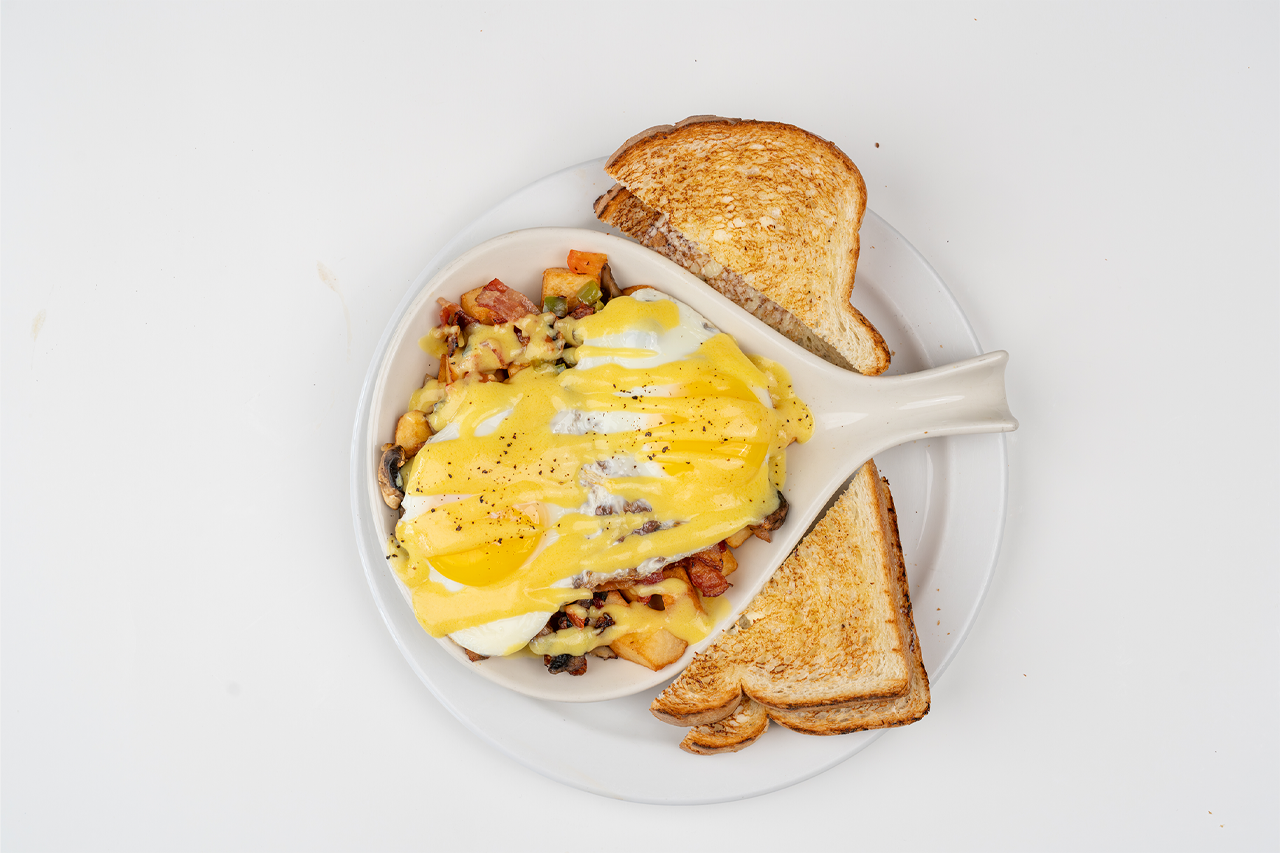 Jambon, bacon ou saucisse avec des oignons, des poivrons verts, des champignons et des tomates servis sur des pommes de terre rissolées et recouverts de deux œufs, le tout nappé de fromage cheddar fondu ou de |