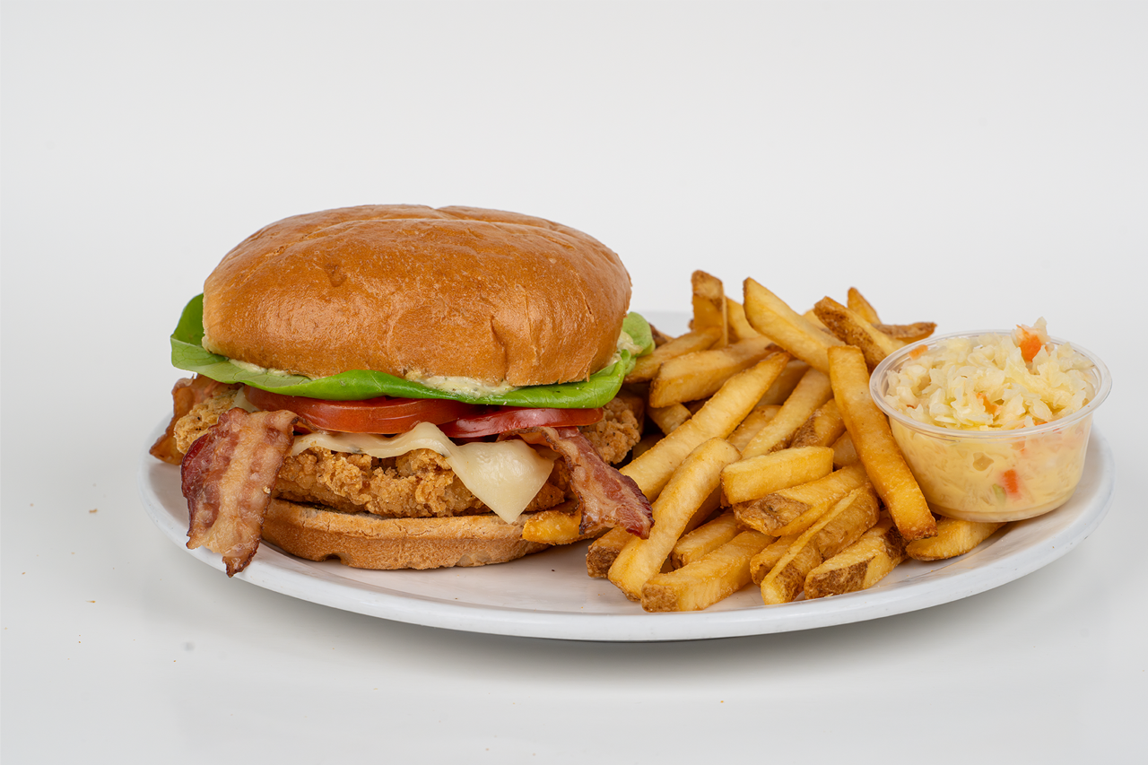 Poitrine de poulet frit assaisonné et croustillant garnie de fromage Monterey Jack épicé fondu, de tomates, de bacon, |