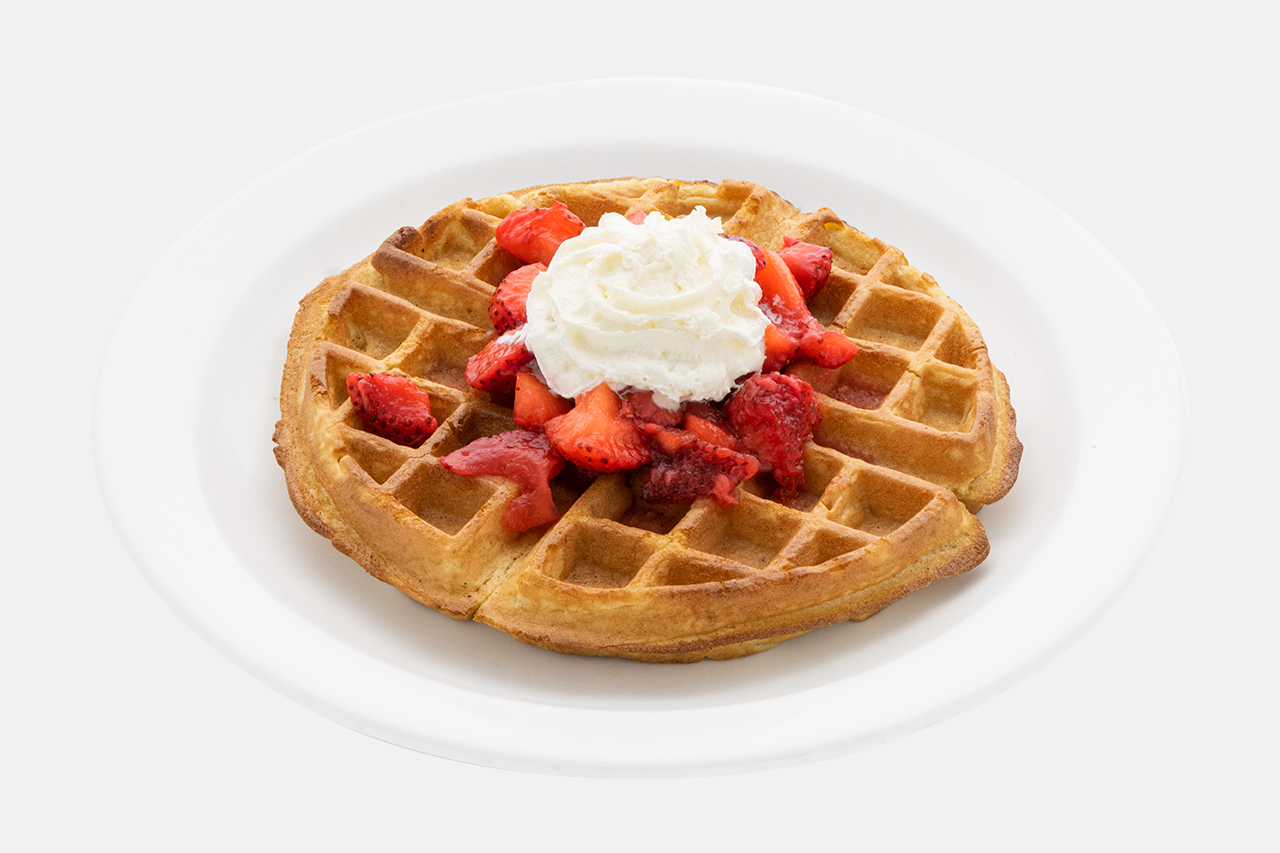 Gaufre belge légèrement grillée recouverte de fruits de saison et de crème fouettée. Servie avec du bacon, de la • Avec du vrai sirop d’érable 1,99 | ![]()